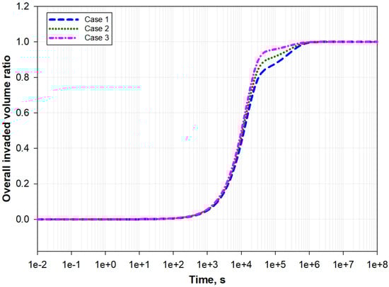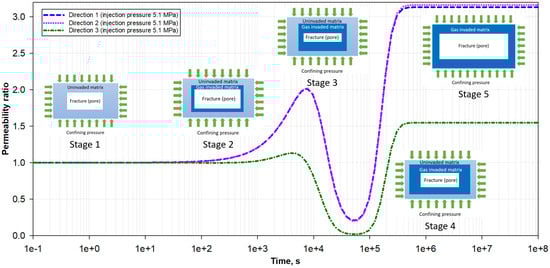 Matrix blocks of natural sorbing fissured rocks may not be identical in terms of adsorbability, gas diffusivity, and mechanical properties. When shale rocks are taken as an example, a dramatical variation of components has been observed experimentally []. These components mainly include pyrite, calcite, kerogen, clay minerals, silica, dolomite, and feldspar []. In this section, the nature of components is taken into account when analyzing directional permeability evolution. For convenience, three major matrix blocks are involved in our simulation. Type 1 (volume fraction: 18% for case 1, 12% for case 2, and 6% for case 3) is mainly composed of kerogen, type two (volume fraction: 35% for case 1, 30% for case 2, and 25% for case 3) mainly consists of chemically unstable minerals (dolomite, feldspar, and calcite), and type 3 (volume fraction: 47% for case 1, 58% for case 2, and 69% for case 3) mainly involves chemically stable minerals (silica). The types and volume fractions of matrix are based on Wu et al. [], and pore volumes in the matrix have been included in these volume fractions. Since detailed mechanical properties of each type are not available, the mechanical properties are classified into kerogen mechanical properties (bulk modulus: Pa and grain mudulus: Pa []) and inorganic matrix mechanical properties (bulk modulus: Pa and grain modulus: Pa []). Other properties of different matrix types are selected to satisfy the overall bulk rock properties of Table 3. The adsorbability reduces in the following order: kerogen, calcite, and clay minerals [], while the diffusivity in kerogen is smaller than that of inorganic matrices ( m2/s for inorganic matrices and m2/s for kerogen []). Swelling strain constants of the three matrix types are as follows: , and for type 1; , and for type 2; and , and for type 3. These swelling properties are selected based on Liu and Rutqvist [] and Peng et al. []. Other input parameters are shown in Table 3. Permeability evolution of three directions under 5.1 MPa injection pressure and 30 MPa confining pressure is presented in Figure 12. In general, different matrix properties mainly affect stages 2 to 4 of the permeability evolution curves, especially stage 4 (the permeability rebound stage). The directional permeability evolution laws are not identical. Stage 2 is almost masked by local swelling in direction 3 due to the less stress-sensitive nature and narrower flow channels ( and ). The permeability rebound stage can be further divided into three substages. This is because the inorganic matrices with larger diffusivity reach matrix–fracture pressure equilibrium faster, as shown in Figure 13. The pressure behavior of pores (fractures) and matrices in Figure 13 is consistent with numerical simulation results of Zhang et al. []. The rapid rebound substage forms during achieving inorganic matrix pressure equilibrium. The permeability increment rate of case 3 with the largest portion of inorganic matrices is the largest. The second permeability increasing stage is generated while approaching kerogen pressure equilibrium. The slope of this period in case 1 with the largest portion of kerogen is the smallest. The third substage with a larger slope is mainly caused by the effective stress reduction when the overall matrix pressure is close to fracture pressure. The peak value of the n-shaped region (stages 2 and 3) decreases in the following order: cases 1, 2, and 3. This is because local swelling effects of case 3 occur and disappear fastest among the three, which is also evidenced by invaded volume ratio evolution given in Figure 14. However, the minimal permeability during the U-shaped region (stages 3 and 4) is in case 1 with the largest portion of kerogen (largest local swelling effects).