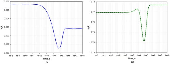 Gas adsorption and desorption generate considerable impacts on permeability evolution of sorbing rocks [,]. Adsorption hysteresis is a critical mechanism for gas production in coal and shale reservoirs []. Here, the way that the hysteresis coefficient affects permeability evolution is investigated. In this case, the hysteresis coefficient is a constant. It characterizes the ratio of available sorption areas for desorption relative to adsorption and changes from 0 to 1 []. The value of 1 means zero hysteresis, and 0 means maximum hysteresis. Theoretically, the Langmuir strain constant during desorption is lower than that of adsorption. For convenience, the Langmuir strain constants in Table 3 are multiplied by 0.95 for desorption in our analyses. The magnitude of the Langmuir strain constants for desorption and adsorption is consistent with those in the literature []. Considering gas extraction, the initial pressure is 5.1 MPa, while the final equilibrium pressure for depletion is 1.1 MPa. The confining pressure is fixed at 30 MPa. As shown in Figure 10, a complete gas–depletion permeability curve also has five stages that reflect the inverse processes of injection curves. As the hysteresis coefficient increases, the desorption-induced concave (downward) regime for local shrinkage becomes more noticeable. When the coefficient is larger than 0.75, further increments result in a marginal permeability change. Aside from this, the magnitudes of the permeability change in three directions show dramatical differences; the lower the flow channel aperture is, the more sensitive the permeability will be during local shrinkage.