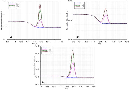 Effects of different matrix blocks on permeability evolution: (a) permeability evolution in direction 1, (b) permeability evolution in direction 2, and (c) permeability evolution in direction 3.
