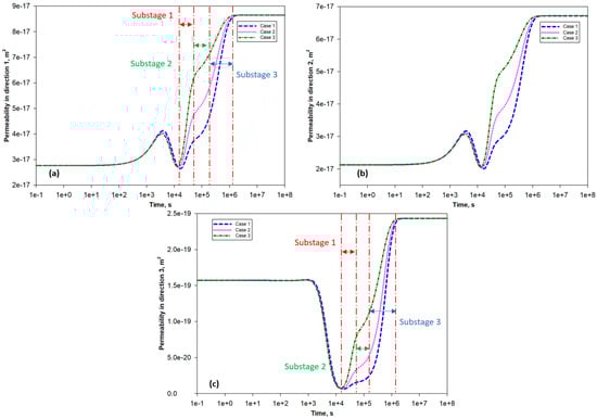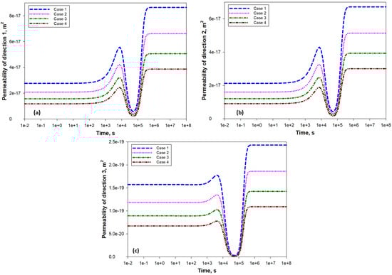 Effects of tortuosity on directional permeability evolution: (a) permeability evolution of direction 1, (b) permeability evolution of direction 2, and (c) permeability evolution of direction 3.