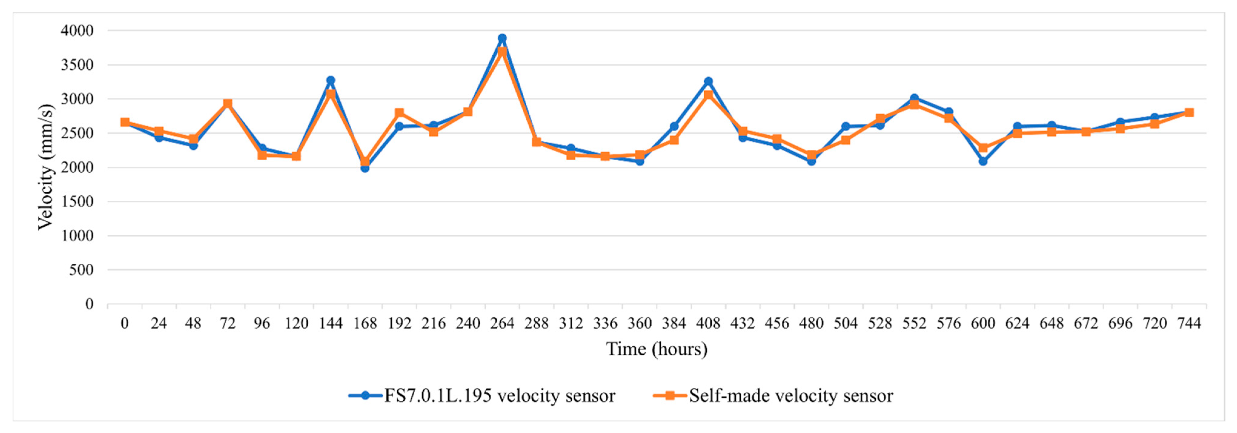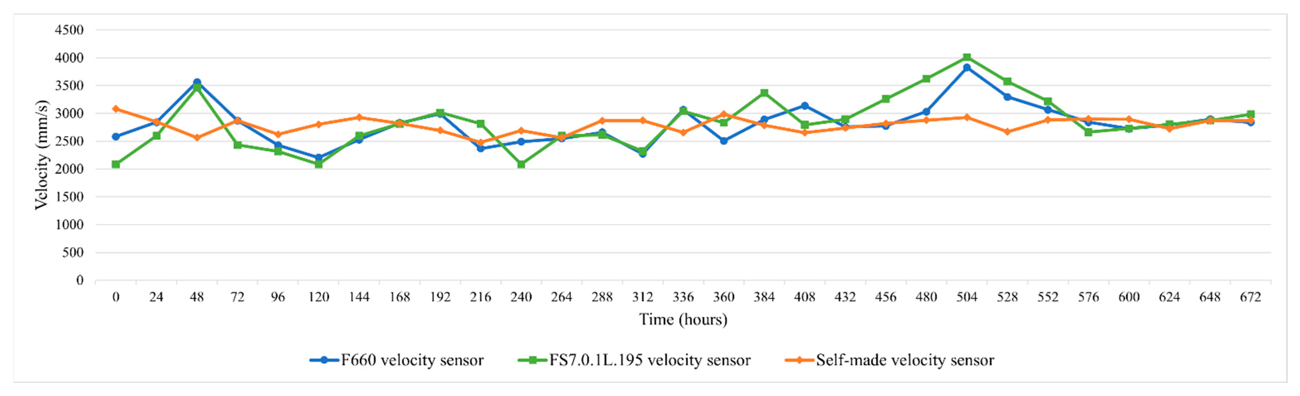 3.2. Comparison of Monitoring Data Between Self-Made Integrated Three-in-One Microsensor and Two Commercially Available Velocity Sensors