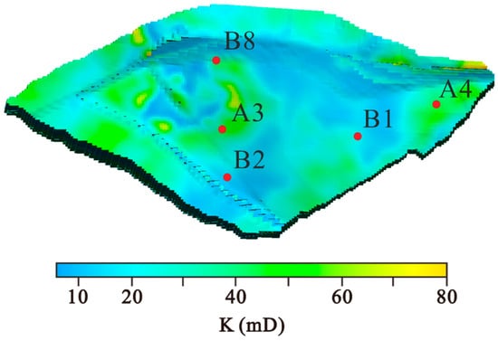 Fracturing oil drive model (permeability model) for WZ oilfield. A3, A4, B1, B2, B8 are the well locations for fracking and oil recovery in WZ oilfield.