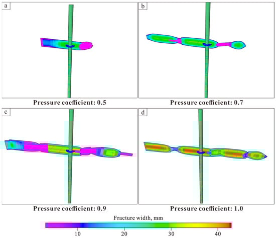 The reservoir pressure coefficient was identified as the most weighted factor. On the one hand, low formation pressure can lead to insufficient energy, reducing capacity and affecting efficiency [,]. On the other hand, according to the results of our numerical simulation, a low pressure coefficient will increase the leakage of fracturing fluid. This leads to a corresponding decrease in the basic parameters of the fracture obtained by fracturing. In formations with higher permeability, the fracture formed by the fracturing fluid will be larger. The greater the effective thickness, the longer the fracture length.