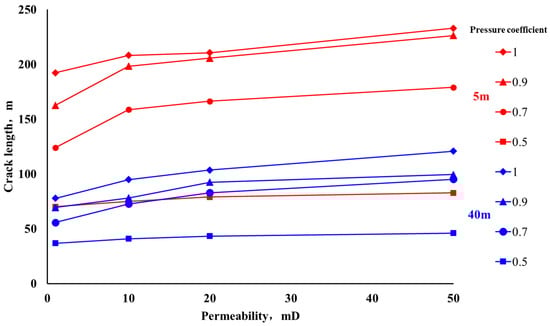 Characteristics of pressure-driven fracture length under different pressure coefficients, permeability and effective thickness conditions (red: effective thickness of formation is 5 m; blue: effective thickness of formation is 40 m).