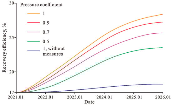 There are significant differences in the effect of increasing production capacity under different pressure coefficients. The higher the pressure coefficient, the higher the recovery rate (Figure 4). But the increase in recovery rate gradually decreases. Under the condition of pressure coefficient of 1, the highest production rate was achieved after 5 years of the implementation of the fracturing and oil driving process. The recovery rate is 4.86% higher than the reservoir with a pressure coefficient of 0.5, relative to no fracturing and driving oil process. It takes 5 years to improve the recovery rate of 10.19%.