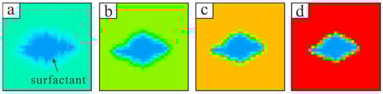 Simulation results of fracturing and oil driving with different permeability ((a): 50% oil saturation; (b): 60% oil saturation; (c): 70% oil saturation; (d): 80% oil saturation).