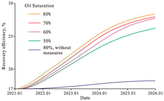 Under the same process, the pressure coefficient is 1, and the effective thickness of the formation is 5 m. With the increase in oil saturation, the earlier the oil is produced, the higher the final recovery rate (Figure 5). Five years after the implementation of the fracturing and driving oil process, 80% oil saturation has a 2.17% higher recovery rate than 50% oil saturation (Figure 6).
