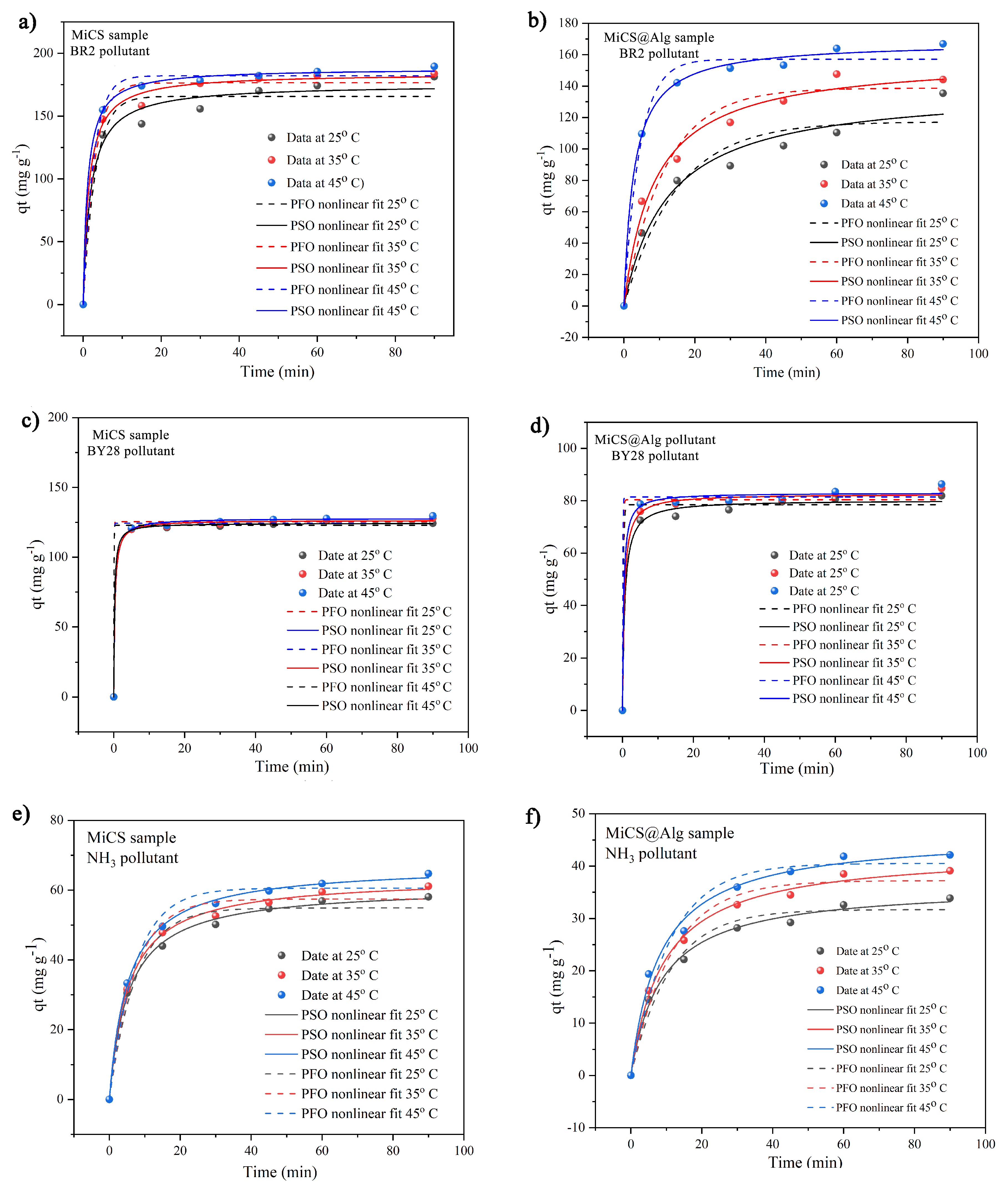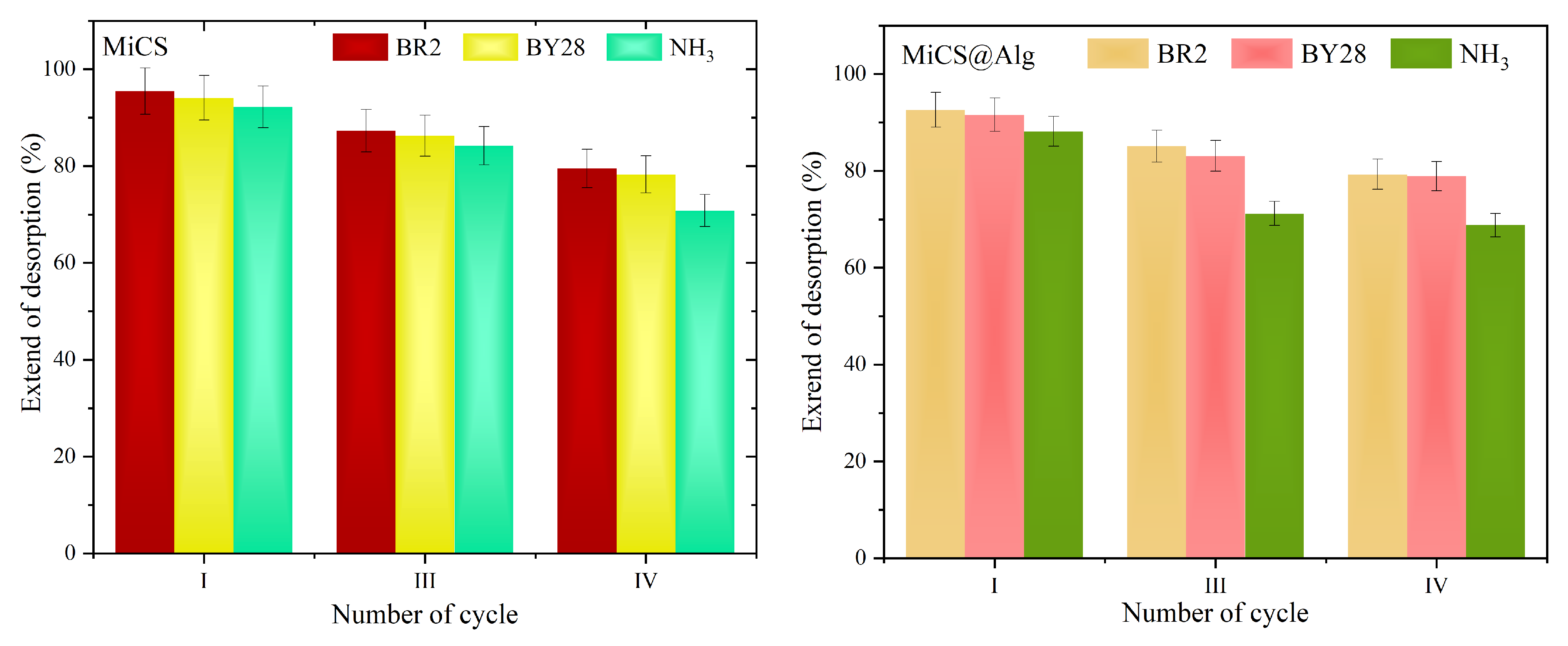 | MiCS@Alg | BR2 | qe (mg g−1) | 117.3 ± 6.61 | 138.9 ± 8.6 |