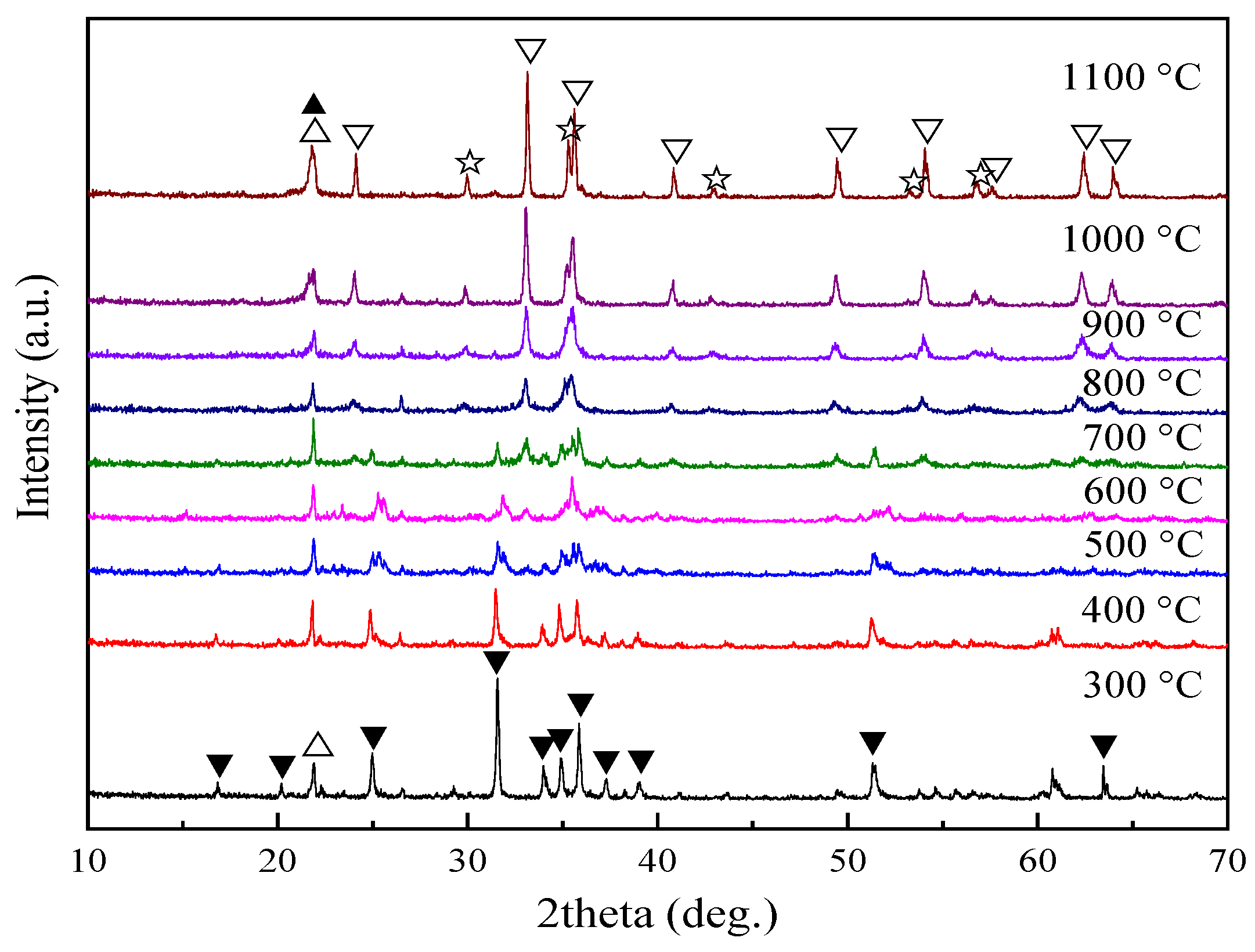 - Liu, H.; Hu, J.; Wang, H.; Wang, C.; Li, J. Multiphase transformation during process of copper slag calcination. J. Cent. South Univ. 2013, 44, 3159–3165. (In Chinese) [Google Scholar]