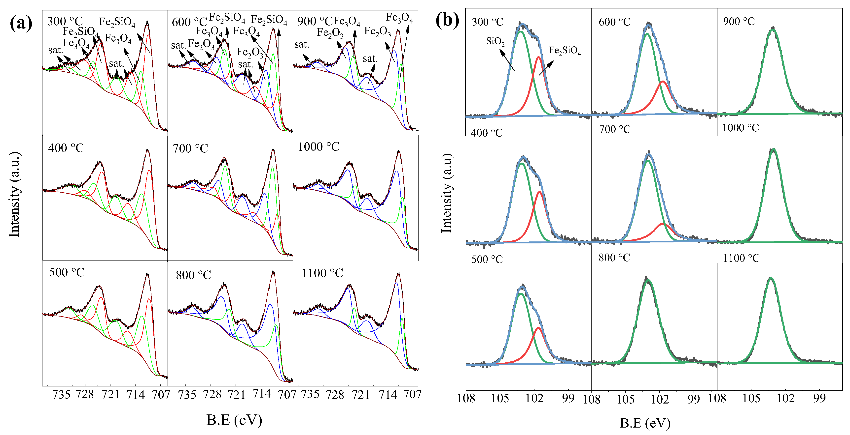 - Elevated roasting temperature promotes the decomposition of fayalite into iron oxide and silica. Meanwhile, the iron oxide can migrate to the particle surface. The thickness of the iron oxide layer reaches about 5.0 μm in the roasted product obtained at 1100 °C.