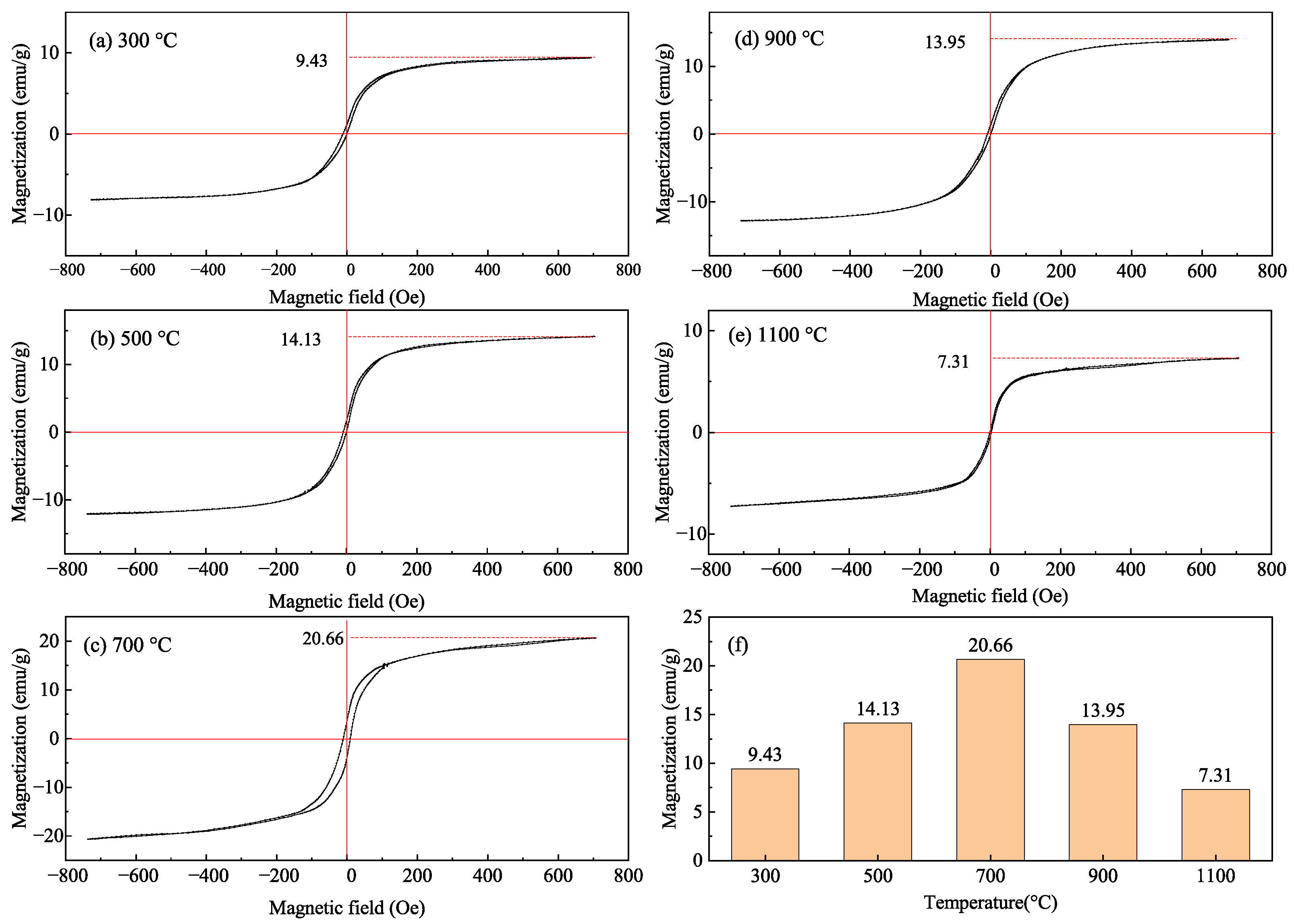 Temperature (°C) | Fe2SiO4 Content (%) | Fe3O4 Content (%) | Fe2O3 Content (%) |
