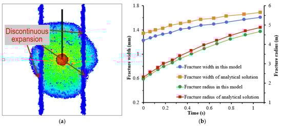 Huang et al. [20] used an artificial cement sample to simulate the propagation behaviour of HF and analysed the influence of bedding plane characteristics and stress conditions on the HF propagation [20]. This paper adopts the same parameters (see Table 1) to conduct numerical simulation. The HF geometry of the numerical simulation is given in Figure 1a. Due to variations in interlayer mechanical properties (e.g., the interface tensile strength is much less than the rock tensile strength), the HFs exhibit markedly discontinuous expansion when crossing the interface. A small part of fracturing fluid leaks off in the interface when the HF crosses the interface. The HF shape and area both agree with Huang’s experiment [20]. During the radial propagation of HFs at the beginning, the HF’s width and radius are both slightly less than the analytical solutions of radial HF, respectively, as shown in Figure 1b. One cause is that the fluid leakoff process in this model is completely different from the Carter’s leakoff used in the analytical solution of the radial HF. Another cause is probably the fracture tip behaviour.