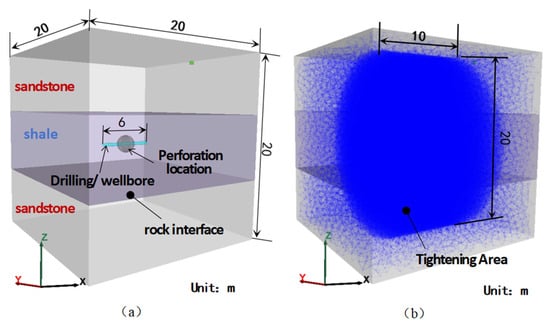The HF propagation behaviour of a sandstone–shale interbed is simulated to study the influence of various factors on the morphology of HF. A basic model comprising three rock layers and two interfaces is established in Figure 2. Its dimensions are 20 × 20 × 20 m. A 6 m-long horizontal wellbore is placed at the centre of the shale layer, with the perforation located at the wellbore centre. The basic parameters of the model are given in Table 2, which are adopted in all the subsequent numerical simulations.