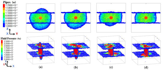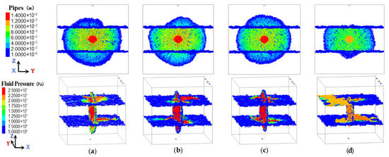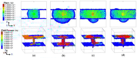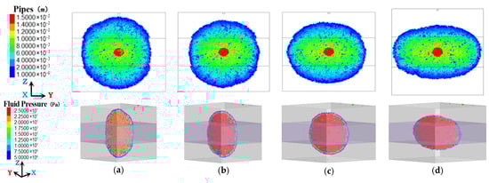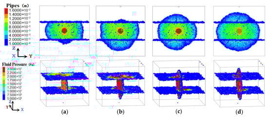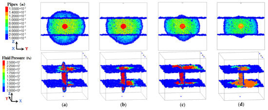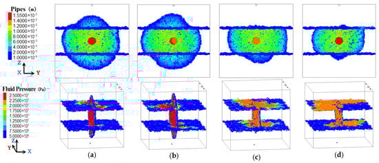 HF propagation patterns and fluid pressure distribution under different tensile strengths of sandstone. (a) 3.5 MPa. (b) 5.0 MPa. (c) 6.5 MPa. (d) 8.0 MPa.