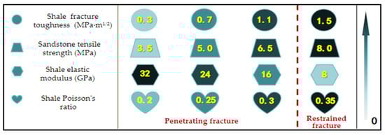 According to Section 3.2 and Section 3.3, a simple sensitivity analysis showing the impact of the rock’s mechanical properties on the HF’s penetration behaviour is given in Figure 7.
