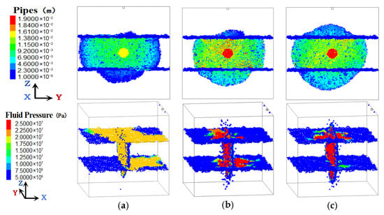HF morphology and fluid pressure distribution at different injection rates. (a) 5 m3/min. (b) 10 m3/min. (c) 15 m3/min.