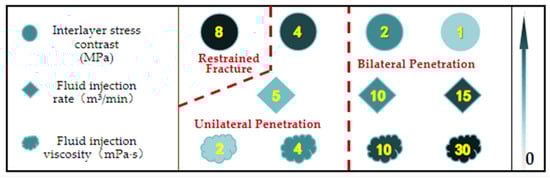 According to Section 3.4 and Section 3.5, a simple sensitivity analysis showing the impact of the stress contrast and fracturing fluid parameters on the HF penetration behaviour is given in Figure 12.