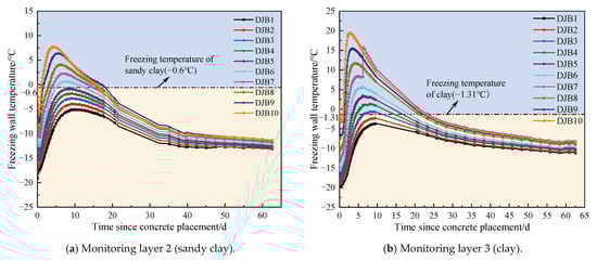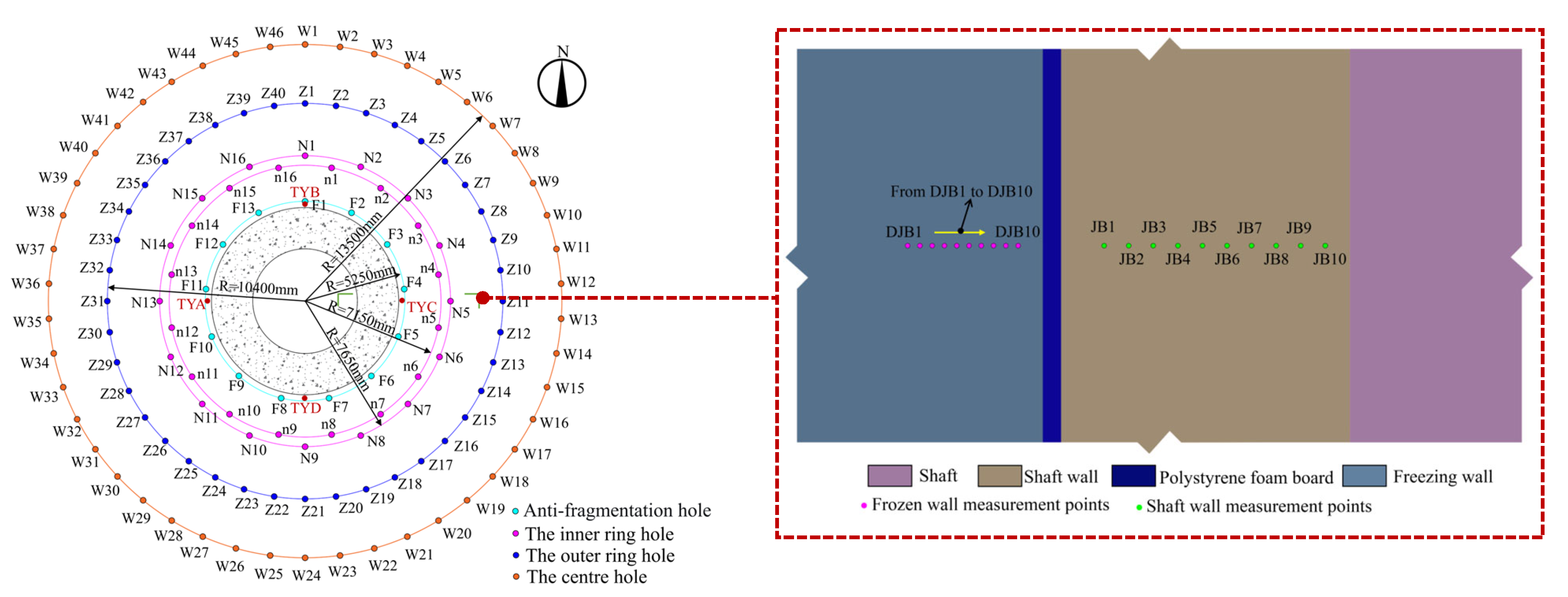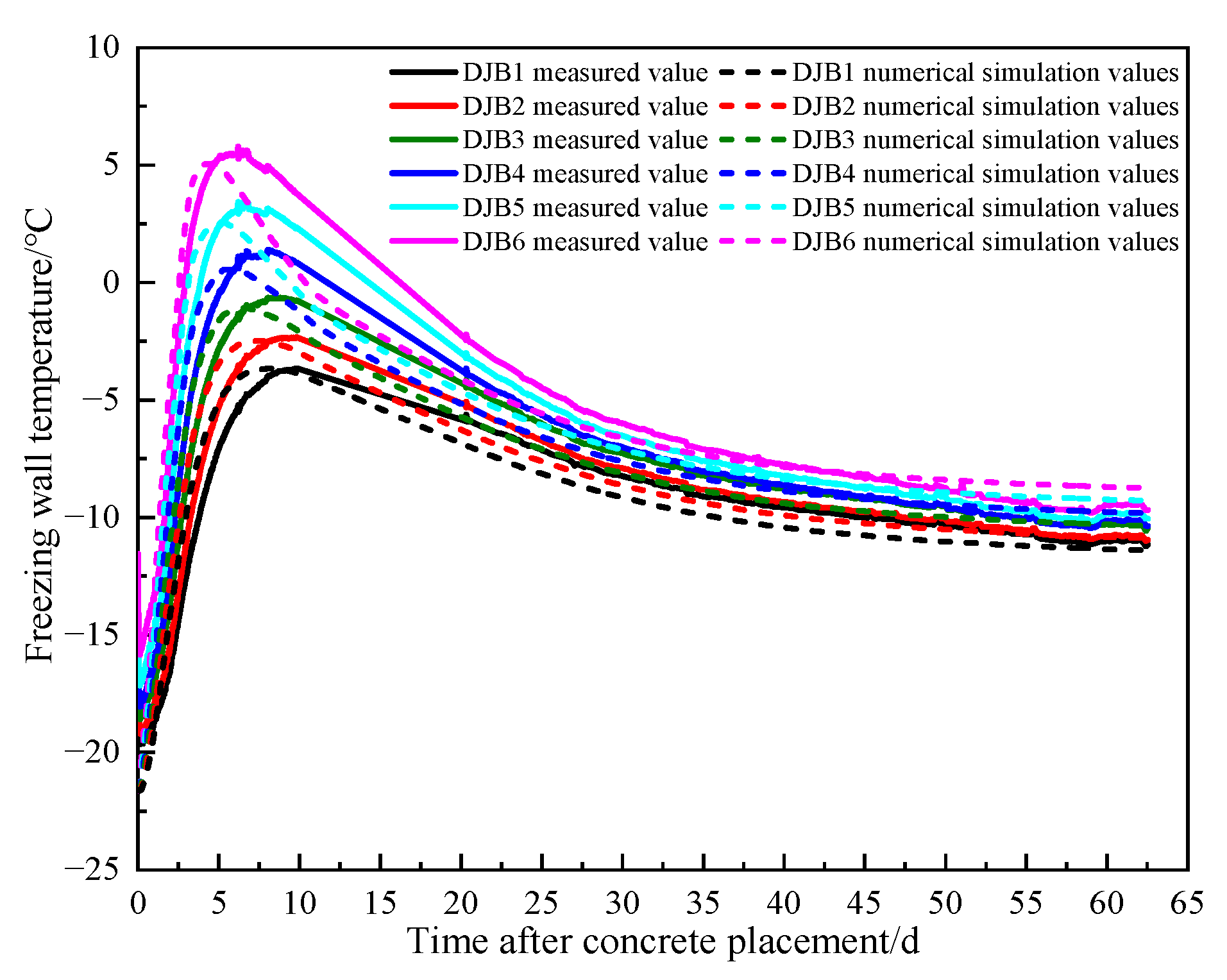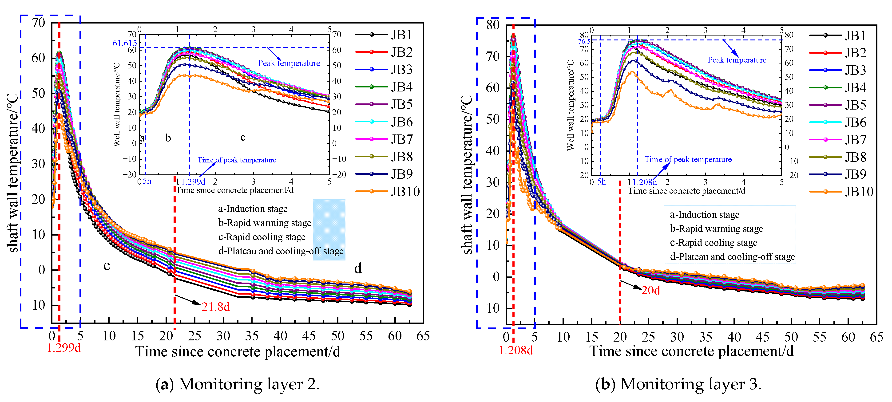 - An analysis of multi-layer field measurement data shows that the thickness of the shaft well lining and the initial temperature are positively correlated with the peak temperature of the shaft well wall, while the initial temperature is negatively correlated with the age of the peak temperature. After the steel fiber concrete is poured, the temperature rise changes in four stages: induction, rapid heating, rapid cooling, and steady cooling. The time taken for measurement points DJB1 to DJB10 to reach peak temperature showed a decreasing trend; the maximum thawing depth times for the second and third layers were approximately 8 d and 7 d, respectively, and the thawing range of the clay layer in the third layer was greater than that of the sandy clay layer in the second layer. The peak freezing pressures for the second and third layers were 0.5 and 0.6 times the design bearing capacity, respectively, to ensure the structural safety of the shaft wall; there were high requirements for the early-age strength of the outer concrete during construction.