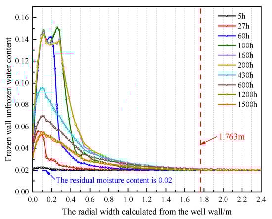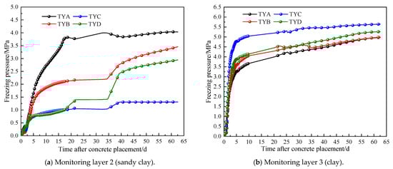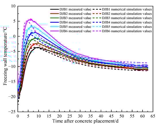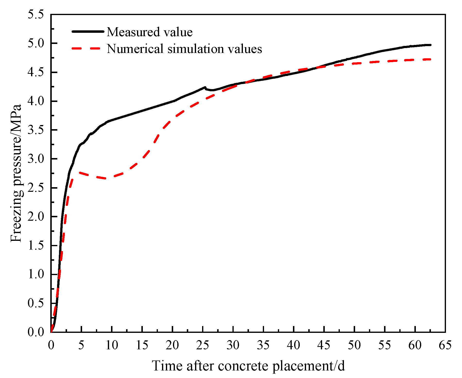 - Taking the third layer as the model example, the unfrozen water content was determined to reach a maximum thaw depth of 0.3576 m after 160 h of pouring, and the error rate between the model and the measured data was 4.64%; the peak temperature of the shaft wall caused by hydration heat reached 73.62 °C at around 27 h, with an error rate of 3.76% between the model and the measured results. The freezing pressure reached a peak of 4.72 MPa around 61.7d, with an error rate of 5.03% between the model and measured data, validating the reliability of the numerical model; additionally, the compressive strength growth of the shaft wall lining met the load-bearing requirements for freezing pressure.