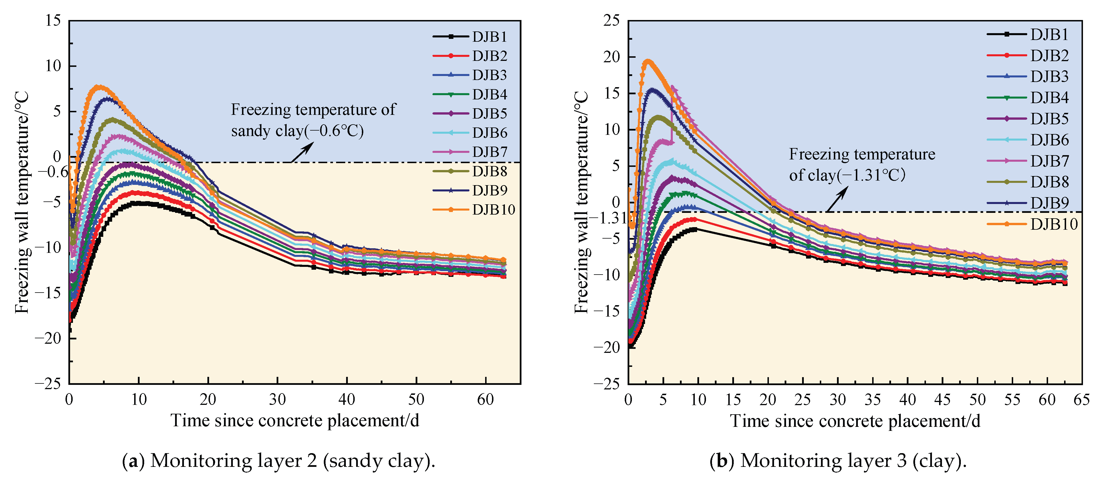 - Zhang, J.; Wang, B.; Rong, C.; Long, W.; Yu, S. Temporal and Spatial Evolution Laws of Freezing Temperature Field in the Inclined Shaft of Water-Rich Sand Layers. Appl. Sci. 2023, 13, 8874. [Google Scholar] [CrossRef]