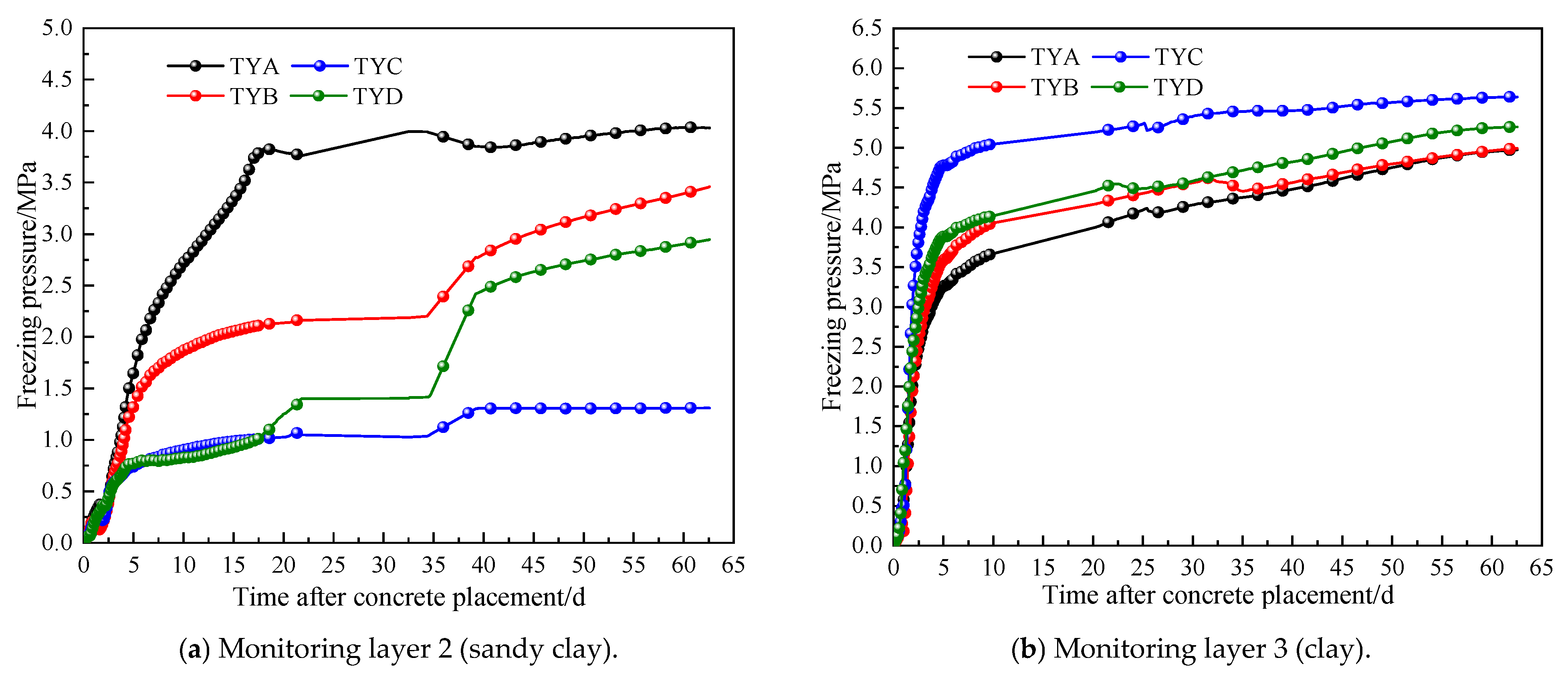 - Liu, B.; Song, C.-J.; Li, T.; Yu, F. Interaction mechanism of deep-buried frozen soil wall and surrounding earth mass in excavation unloaded state. Editor. Off. J. China Coal Soc. 2012, 37, 3–7. [Google Scholar]