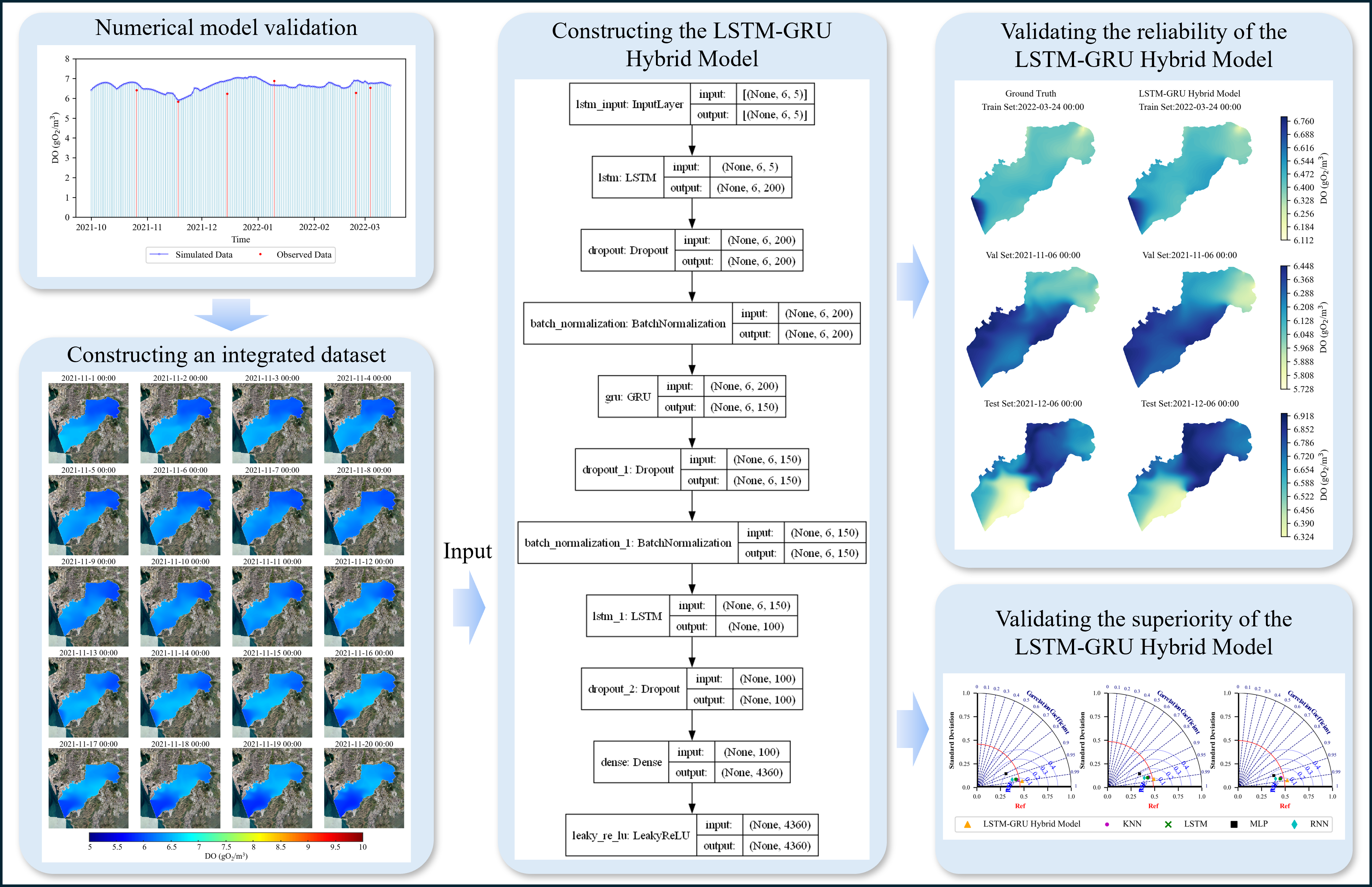 This study develops the LSTM-GRU Hybrid Model to predict the distribution of dissolved oxygen concentration in the Shenzhen Bay area. The LSTM-GRU Hybrid Model combines the advantages of LSTM networks and GRU networks to enhance the spatiotemporal sequence modeling capability and prediction accuracy. The model architecture is shown in