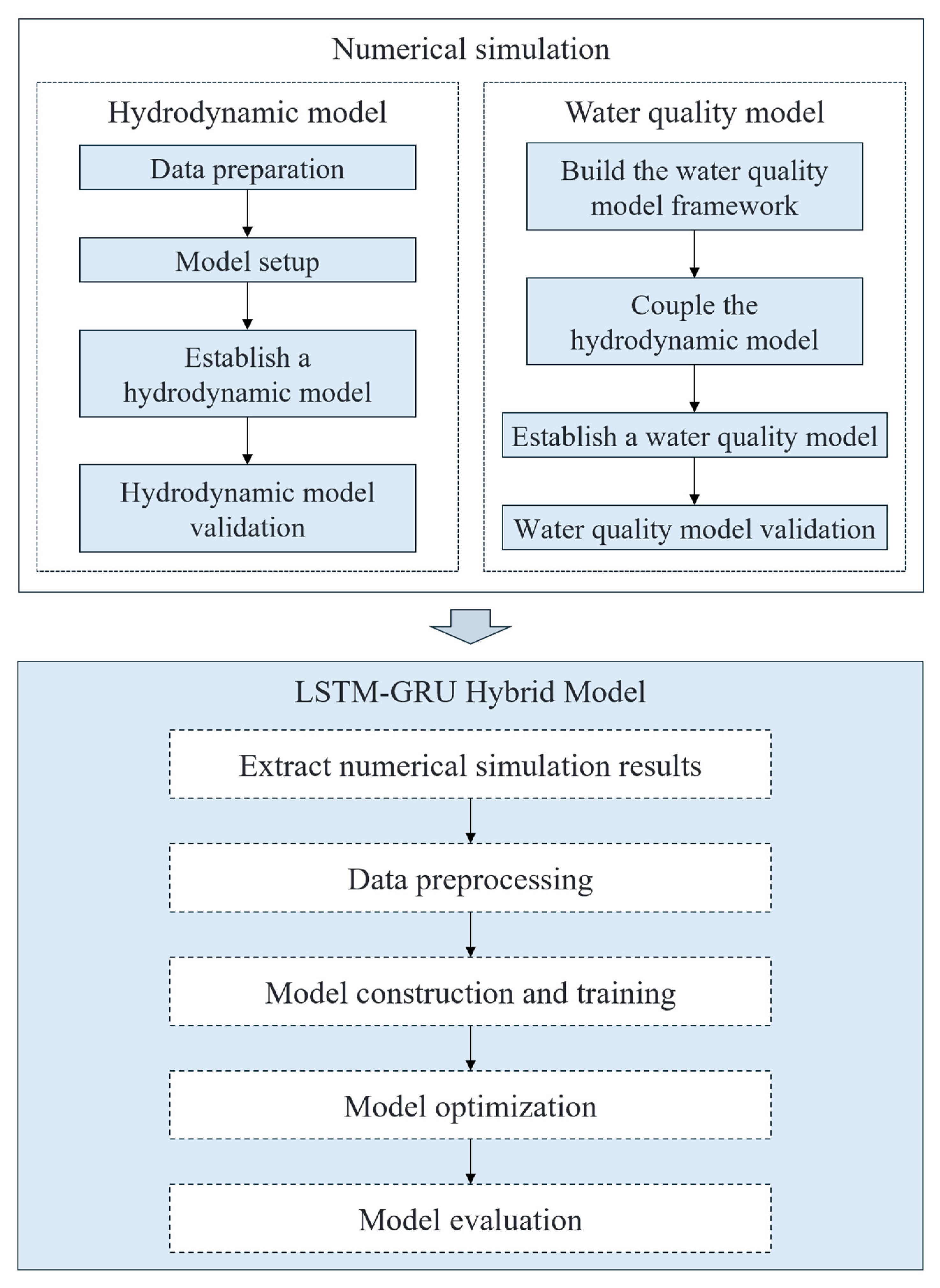 Figure 1. Firstly, based on the actual conditions of the study area, data preparation is conducted, including the collection of necessary hydrodynamic data. The model setup is performed by selecting appropriate physical parameters, and a hydrodynamic model is established based on Delft3D FM (Deltares, Delft, The Netherlands). The model is then validated to ensure the accuracy and reliability of the hydrodynamic simulation results. Building upon the existing hydrodynamic model, a water quality model framework is further developed, with dissolved oxygen as the primary water quality factor for simulation, followed by model validation. Based on the numerical simulation results from the hydrodynamic and water quality models, the LSTM-GRU Hybrid Model is constructed. The dissolved oxygen concentration data from four key boundary points in the research area over the past six days are used as input (the statistical characteristics of the input and target variables are shown in