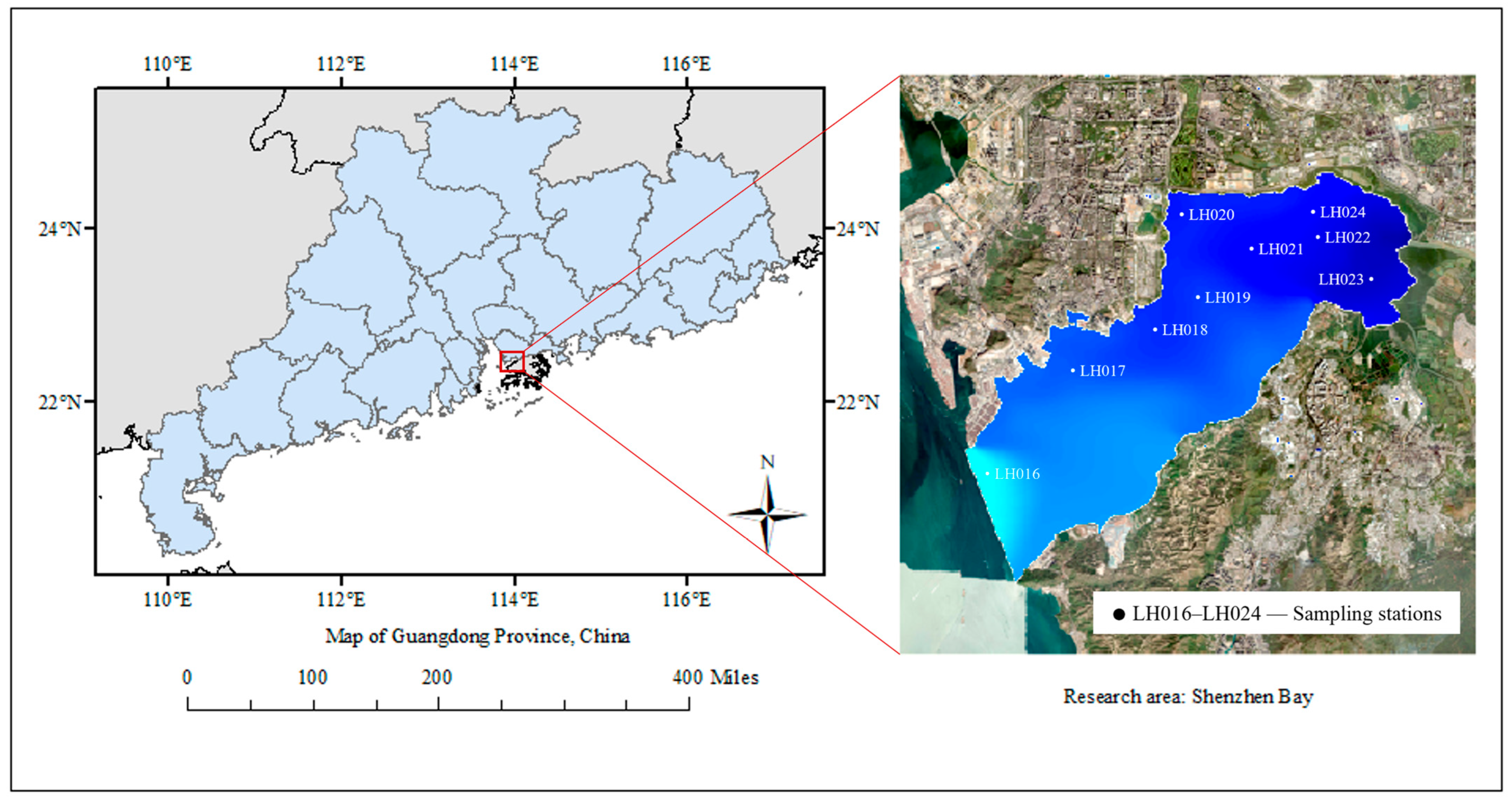 Shenzhen Bay is located in the southern part of Guangdong Province, China, situated between the city of Shenzhen and the Hong Kong Special Administrative Region. It is a typical semi-enclosed water body and is part of the Pearl River Estuary water system. As shown in