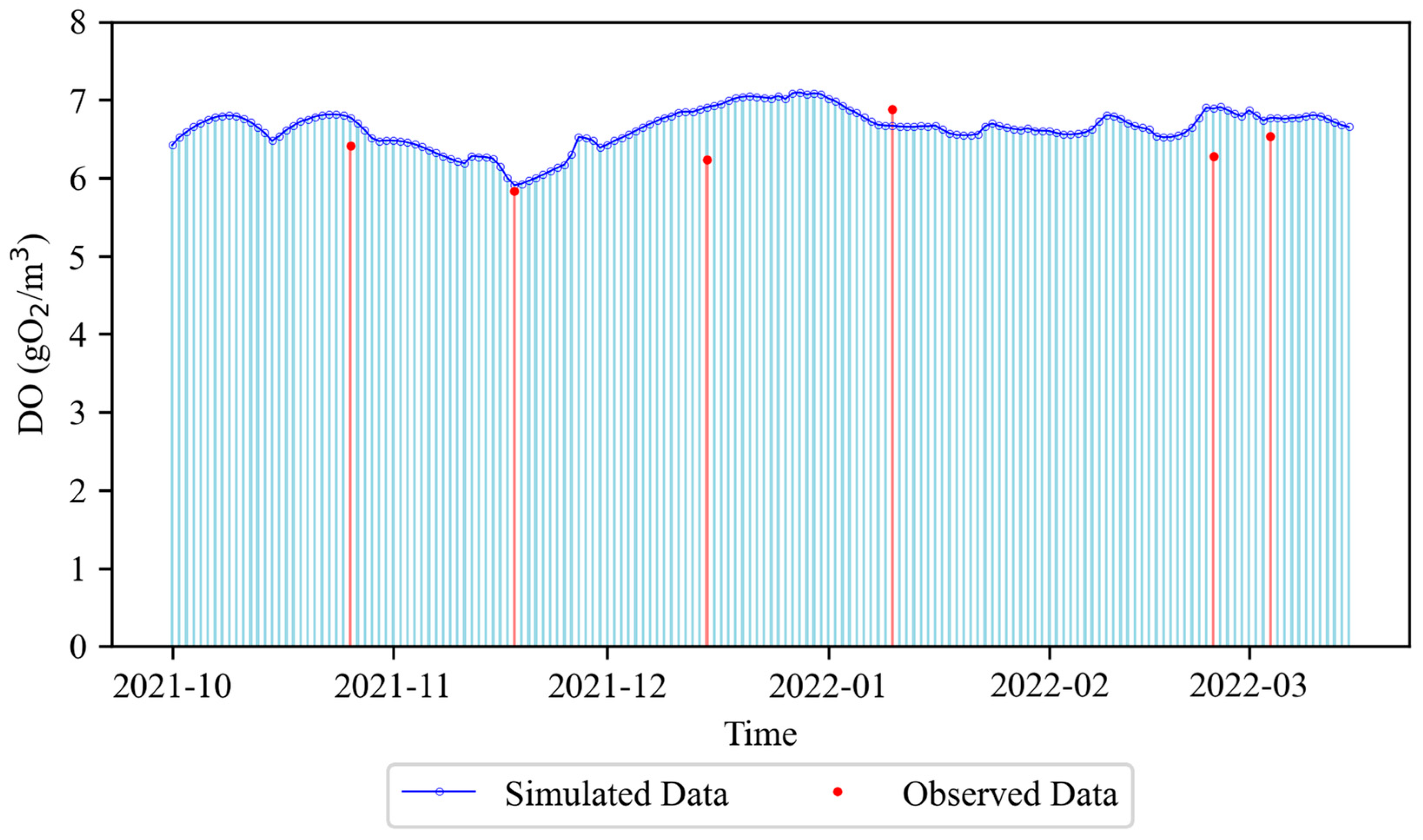 −3. The water transparency is represented by a Secchi depth of 2 m, and the meteorological conditions are based on daily meteorological data from October 2021 to June 2022. The water quality model selects dissolved oxygen as the simulated substance, coupled with hydrodynamic simulation results. The initial conditions are obtained through spatial interpolation of the monitoring data from LH016 to LH024, and the dissolved oxygen boundary conditions at the bay entrance and river mouths are set according to water quality observation data.