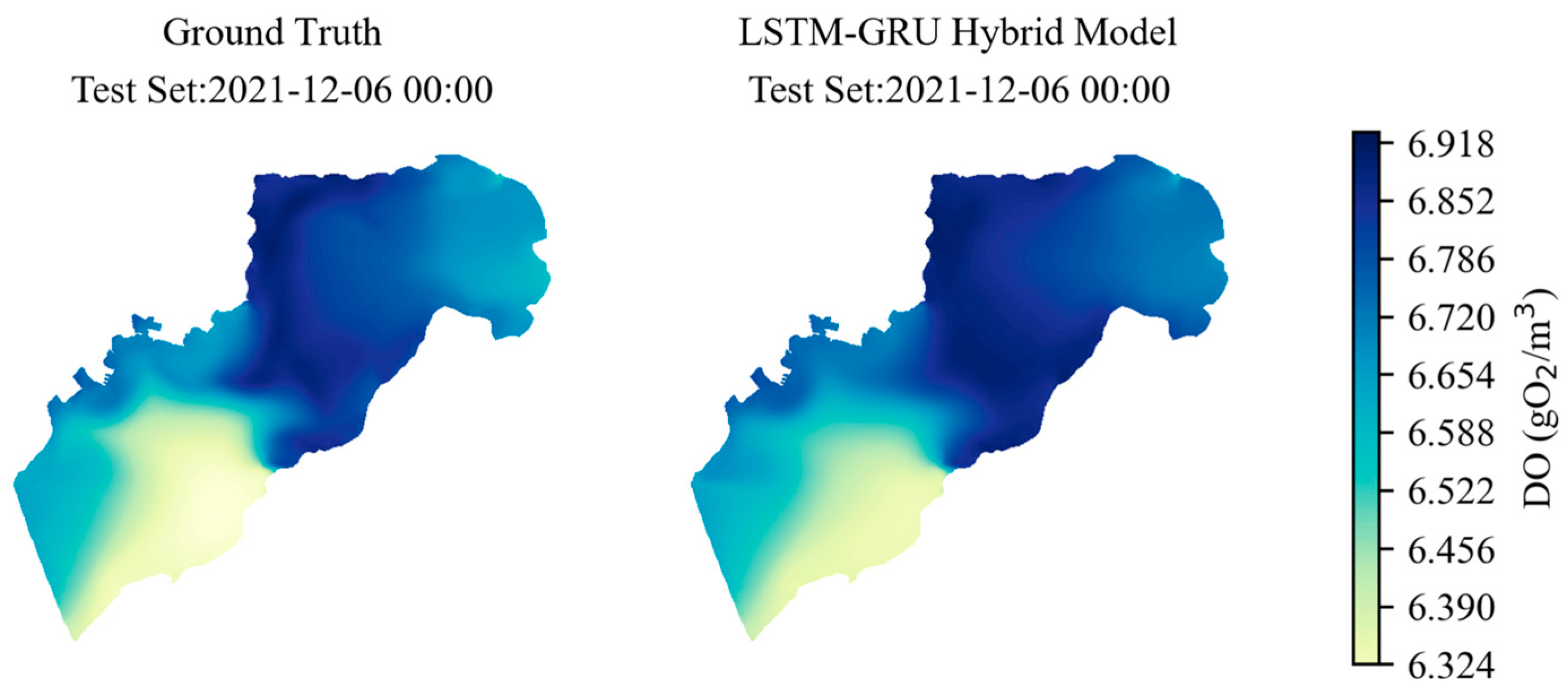 Compared to traditional experimental measurements and CFD numerical simulations, machine learning methods offer significant advantages in this study. Traditional in situ monitoring relies on discrete point sampling, which is limited by the density of device deployment and measurement frequency, making it difficult to achieve high-frequency observation over large-scale spatial regions and long time periods. CFD methods can simulate hydrodynamic-ecological coupling processes, but their computational efficiency is constrained by grid resolution, parameterization schemes, and boundary condition uncertainties. In complex water bodies like Shenzhen Bay, which are affected by multiple factors such as tides, runoff, and pollution discharge, CFD simulations can take hours to complete. In contrast, the LSTM-GRU Hybrid Model, through a data-driven approach, learns the spatiotemporal correlations in the data, enabling the analysis of nonlinear interactions without explicitly constructing physical equations. This reduces the prediction time to seconds while maintaining prediction accuracy, improving computational efficiency by one order of magnitude and demonstrating its strong potential to replace and supplement traditional methods.