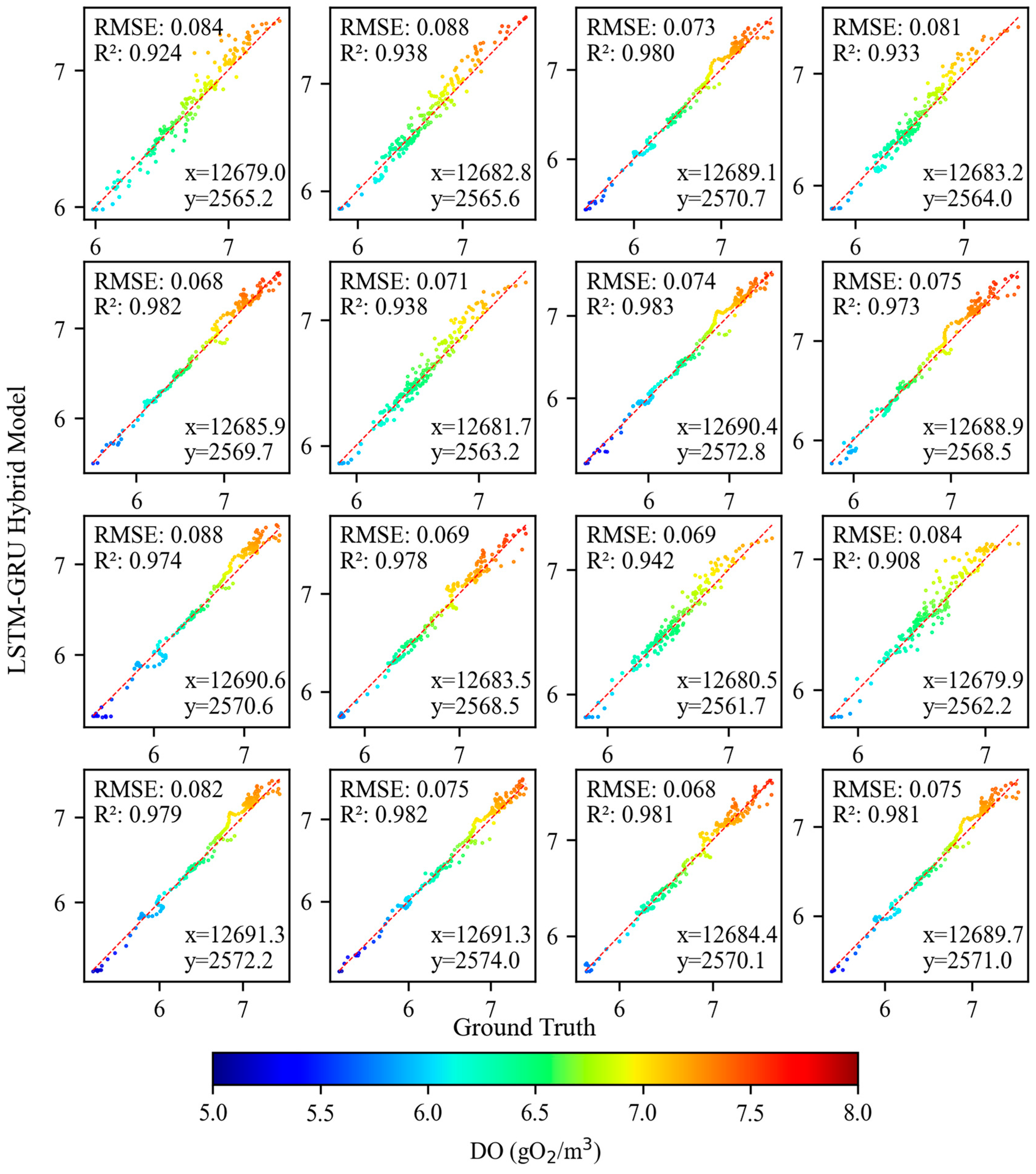 2 of 0.91 and an RMSE of 0.11. Similarly, this study verifies the advantages of deep learning in capturing the nonlinear dynamic characteristics of water bodies. Compared with the standalone LSTM model, however, the proposed LSTM-GRU Hybrid Model further improves prediction accuracy and stability, achieving an R