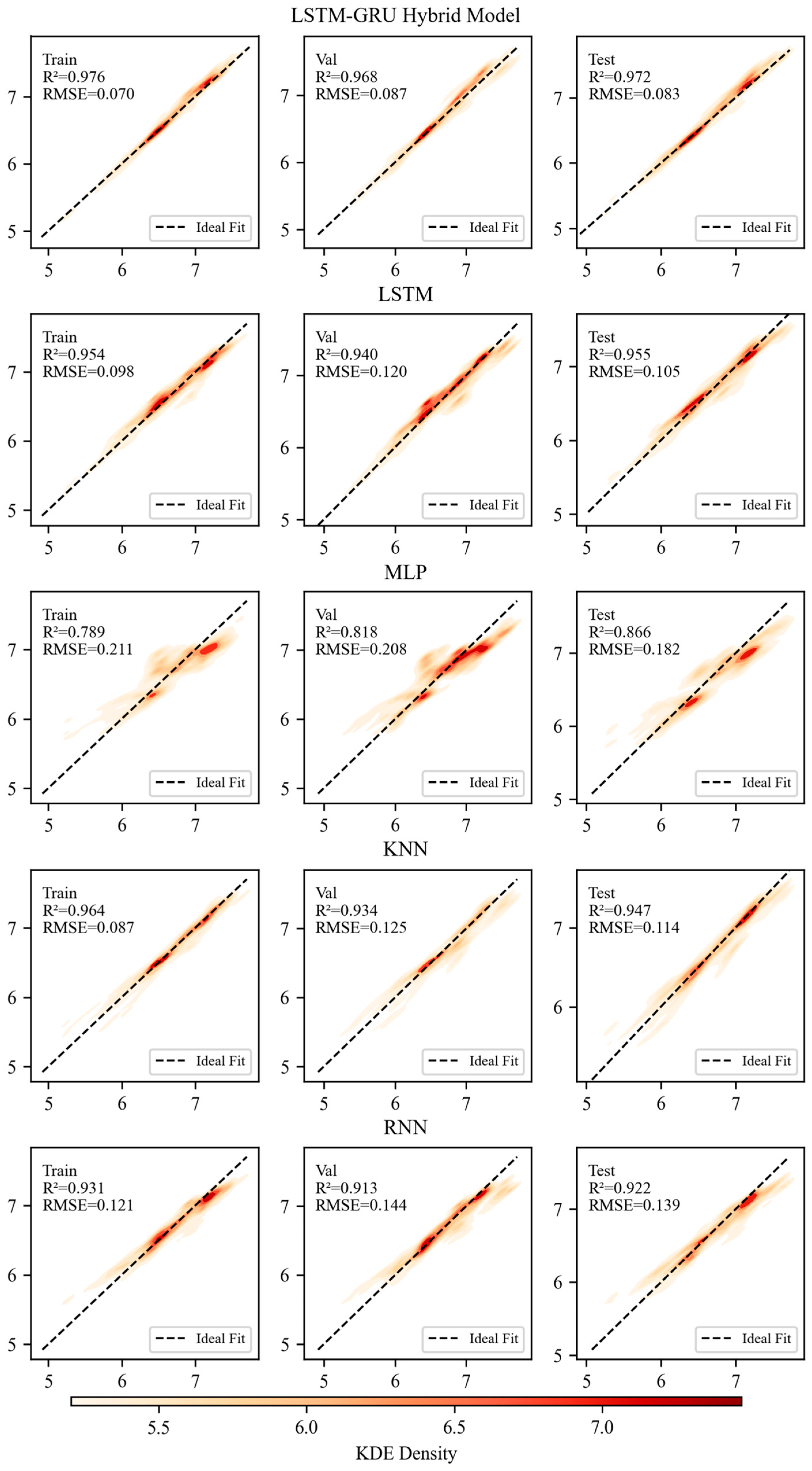 Compared to other machine learning models, such as KNN, MLP, RNN, and LSTM models, the LSTM-GRU Hybrid Model shows significant advantages in the training, validation, and testing stages, as shown in