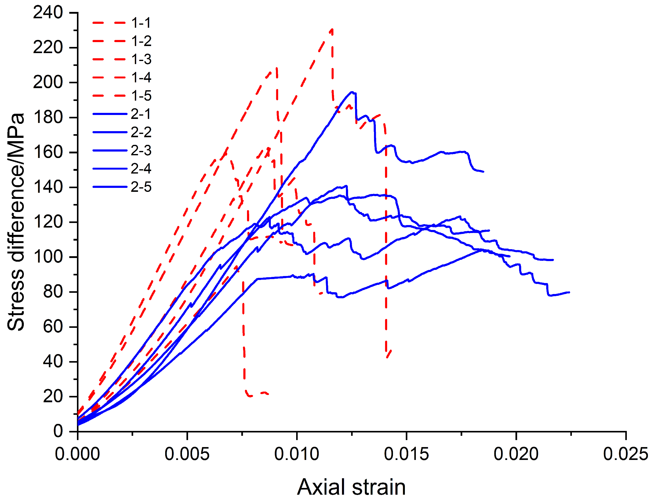 Figure 2, where Tests 1-1 to 1-5 were conducted under a confining pressure of 5 MPa, and Tests 2-1 to 2-5 under 10 MPa. The explanation of