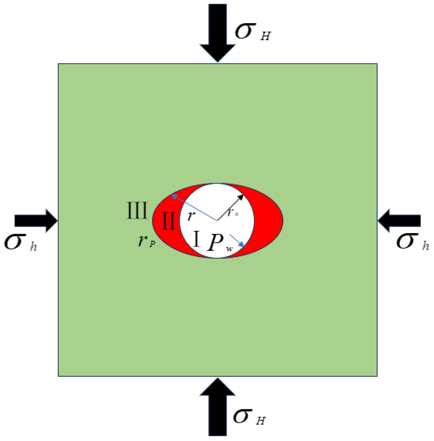 In this model, denotes the distance from any point on the plastic boundary to the center of the wellbore; represents the radius of the original wellbore; indicates the critical interface between the elastic and plastic zones; and stands for the drilling fluid pressure. Region I (in white) corresponds to the circular wellbore, with a size approximately equal to the drill bit diameter; Region II (in red) refers to the plastic transition zone around the wellbore where stress is concentrated but collapse has not yet occurred; and Region III (in green) represents the elastic zone surrounding the wellbore.