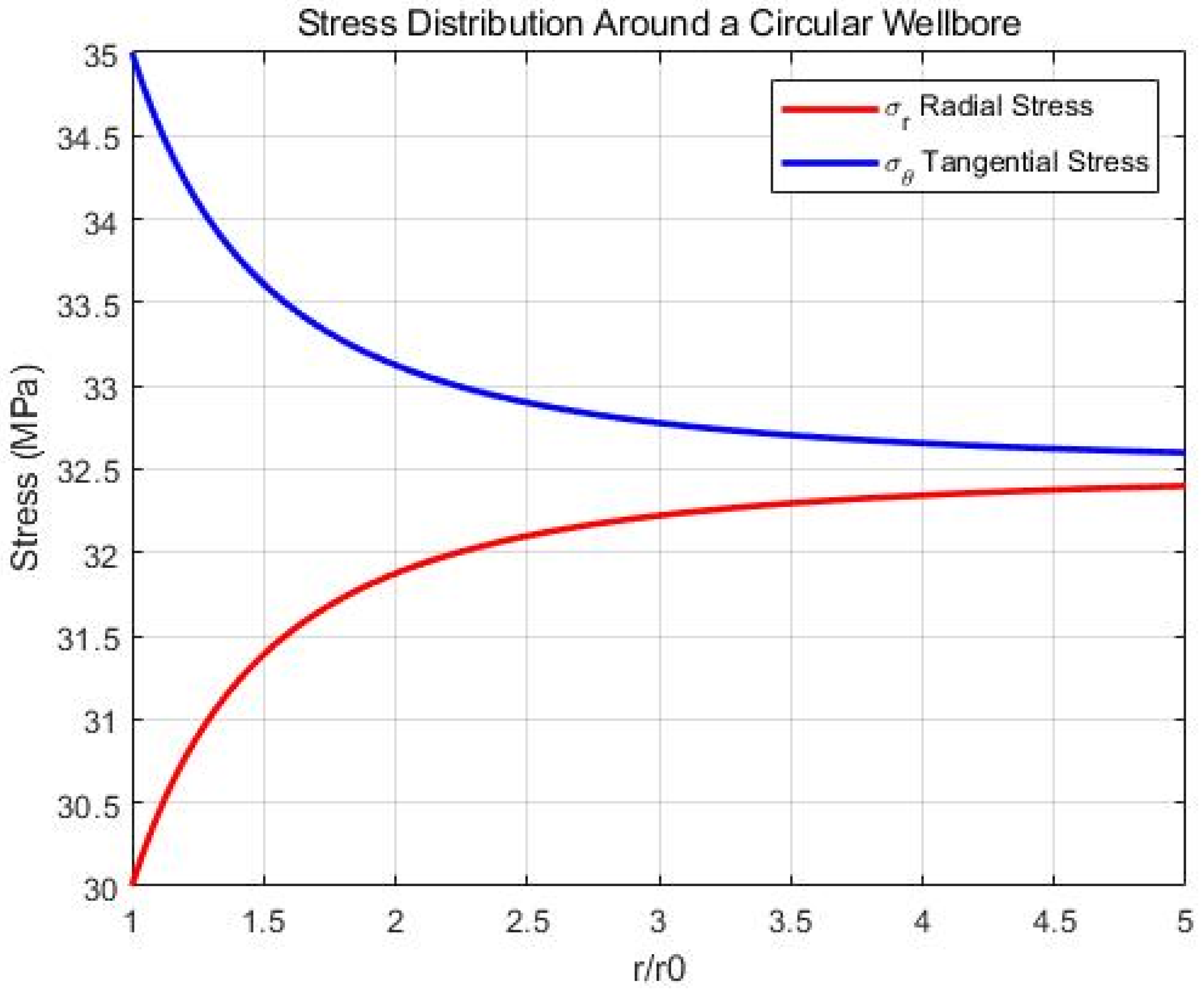 Section 3, two computational programs were developed to numerically solve and visualize boundary stresses around both circular and elliptical wellbores. Leveraging matrix operations, the programs perform step-by-step numerical stress calculations under various working conditions by inputting parameters such as wellbore geometry, material properties, and initial conditions. They first read these parameters, then employ iterative or matrix-based methods to compute stress distributions near the wellbore wall using the derived stress equations. Subsequently, curves illustrating stress variation with radial distance are generated, with each curve representing stress trends under distinct conditions.