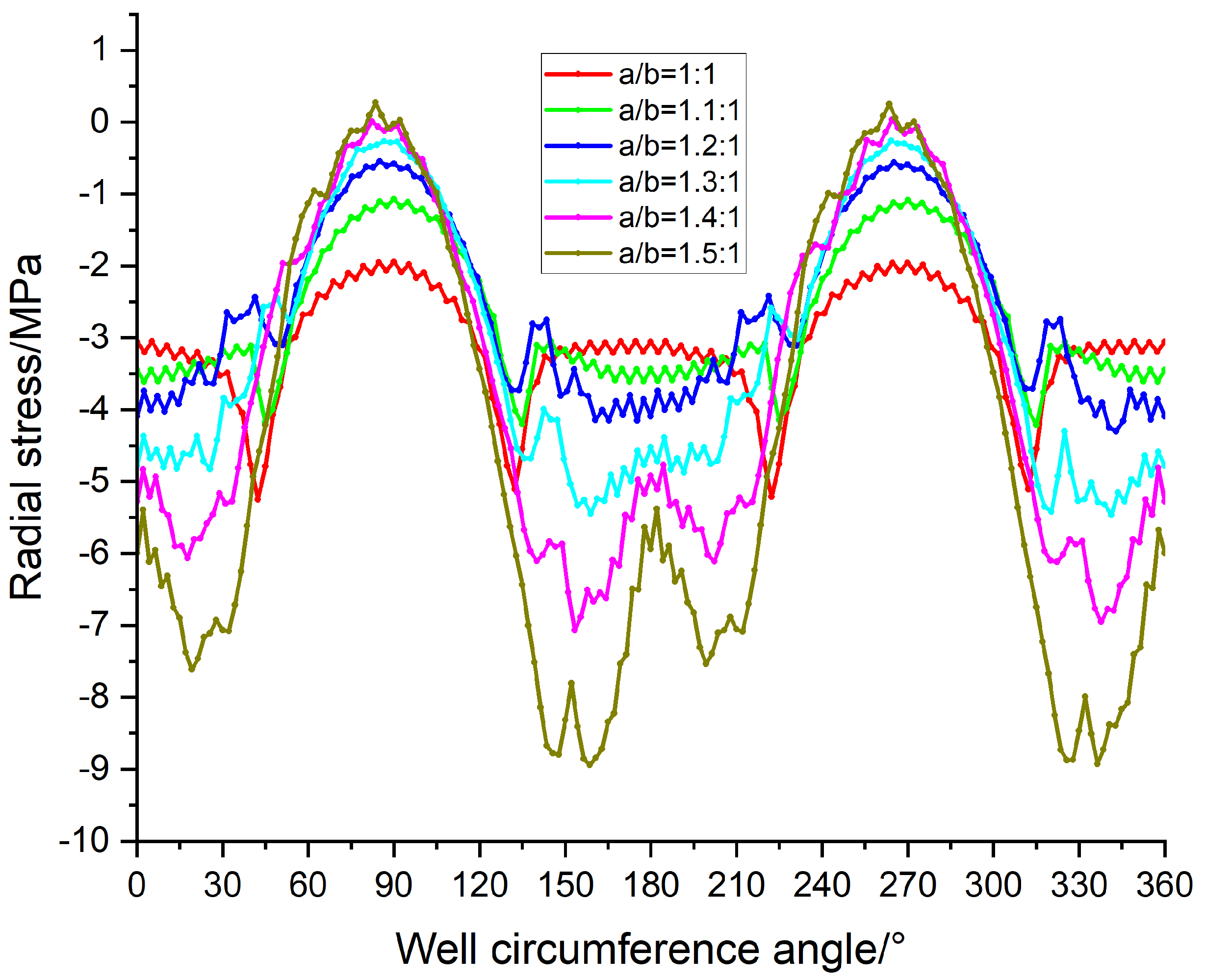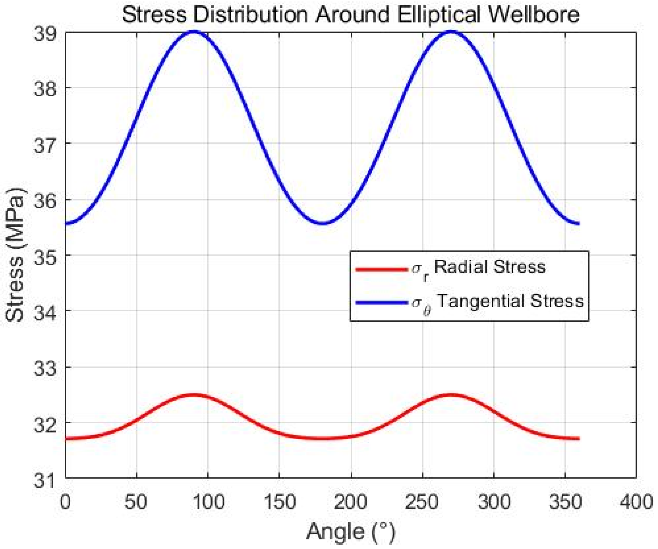 Figure 11 is a polar diagram illustrating the distribution of radial and tangential stresses at various angles around the elliptical wellbore. Both stresses vary with angle: radial stress is generally lower overall, while tangential stress shows a greater amplitude of change. In general, tangential stress fluctuates considerably with angle, whereas radial stress remains relatively stable. These characteristics indicate that the elliptical wellbore shape significantly affects the surrounding stress distribution, particularly the noticeable fluctuations in tangential stress.
