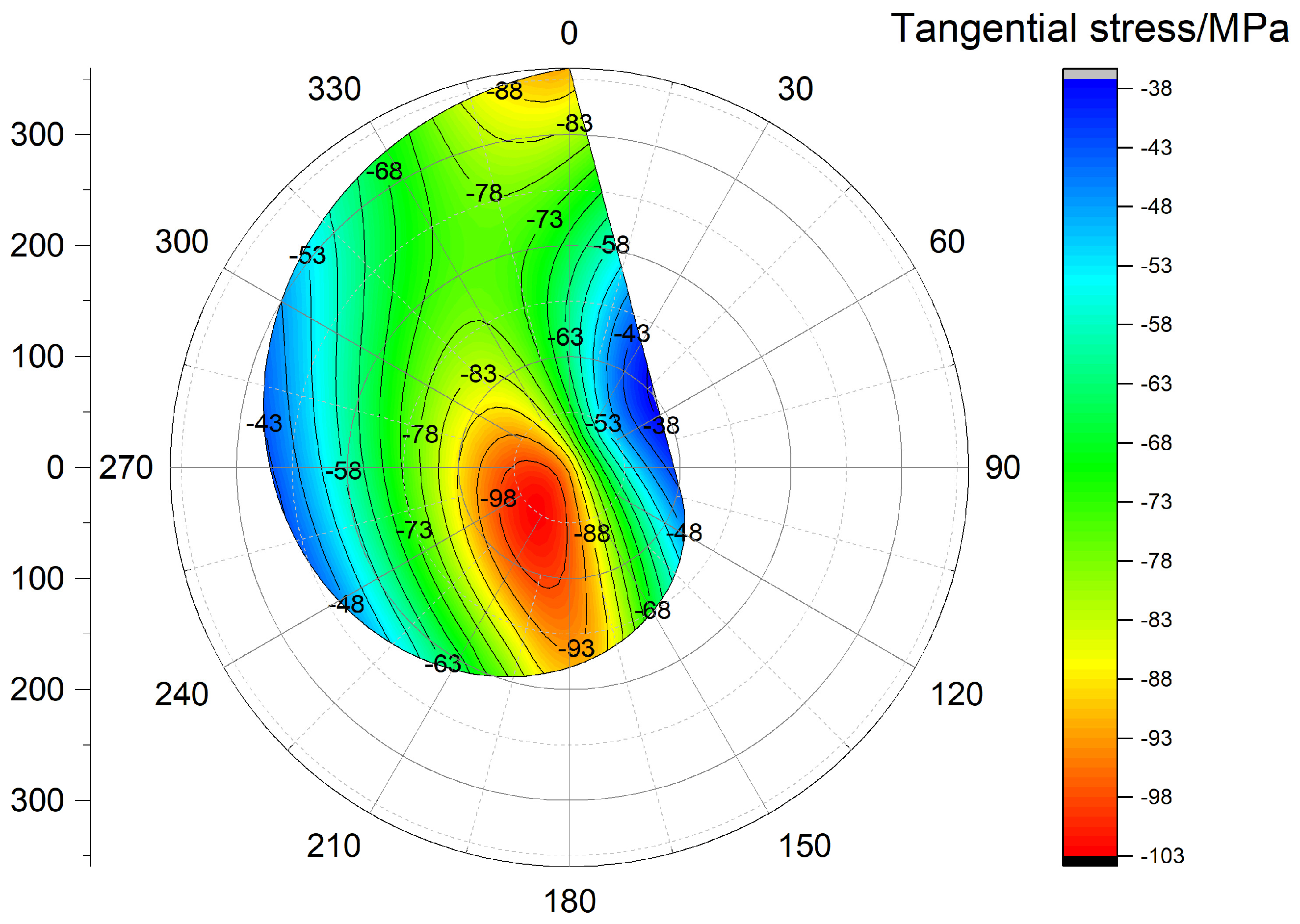 Figure 10 displays stress distribution curves, with the horizontal axis representing angle and the vertical axis denoting stress magnitude. Tangential stress reaches its maximum near 90° and 270°, exhibiting periodic fluctuations, while radial stress remains relatively stable with minimal variation.