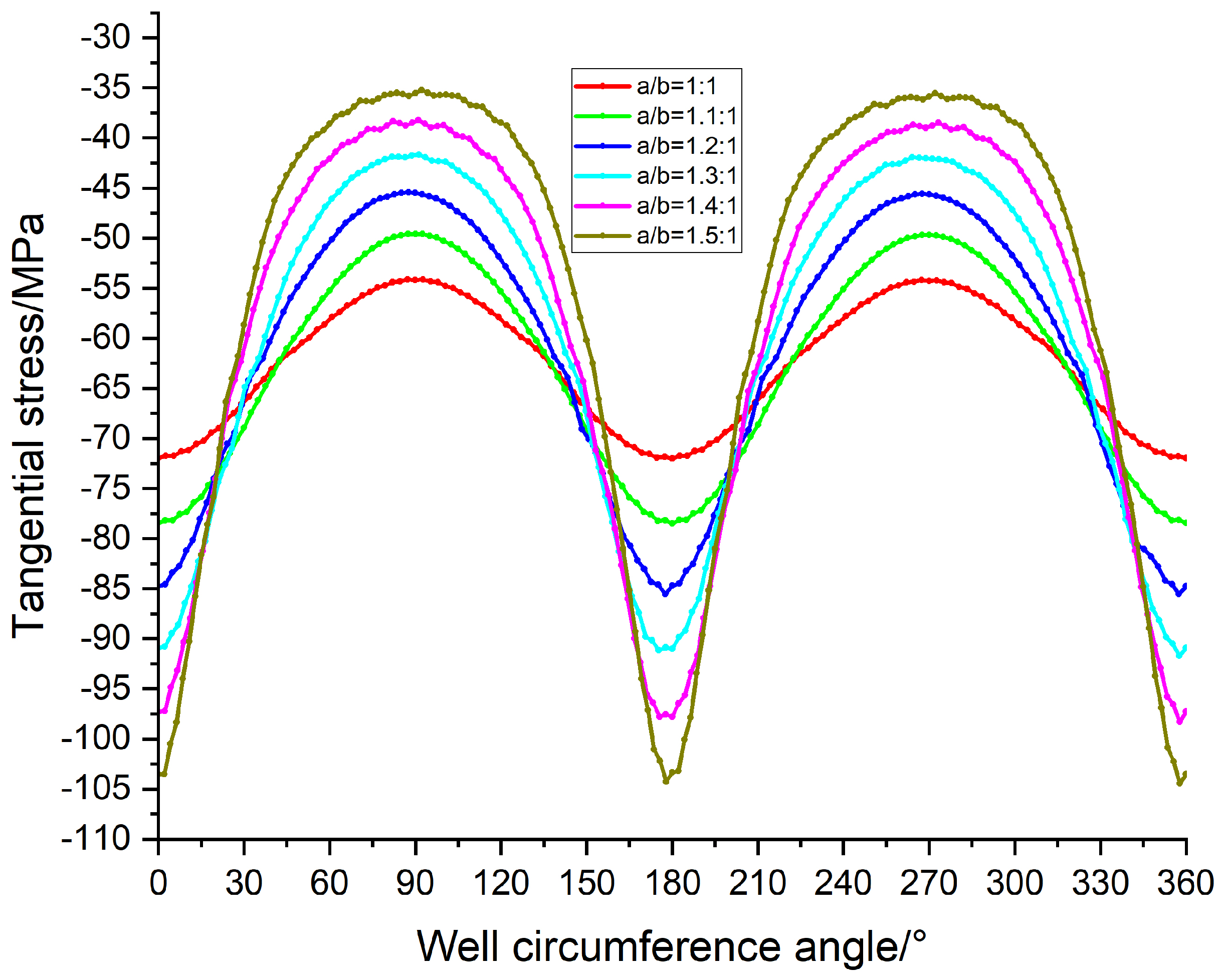 Figure 15 illustrates the variation in tangential stress with circumferential angle for the elliptical wellbore under different aspect ratios. It can be seen that as the aspect ratio increases from 1:1 to 1.5:1, the extreme values of tangential stress gradually increase, with the most significant stress concentration occurring near 180° and 360°. This indicates that when the wellbore shape transitions from circular to elliptical, the stress concentration effect in the surrounding rock becomes more intense, subjecting the wellbore wall to higher tangential stress and thus increasing the risk of wellbore instability. Additionally, the periodic fluctuation of tangential stress reflects the mechanical behavior of the wellbore in a non-uniform stress field.