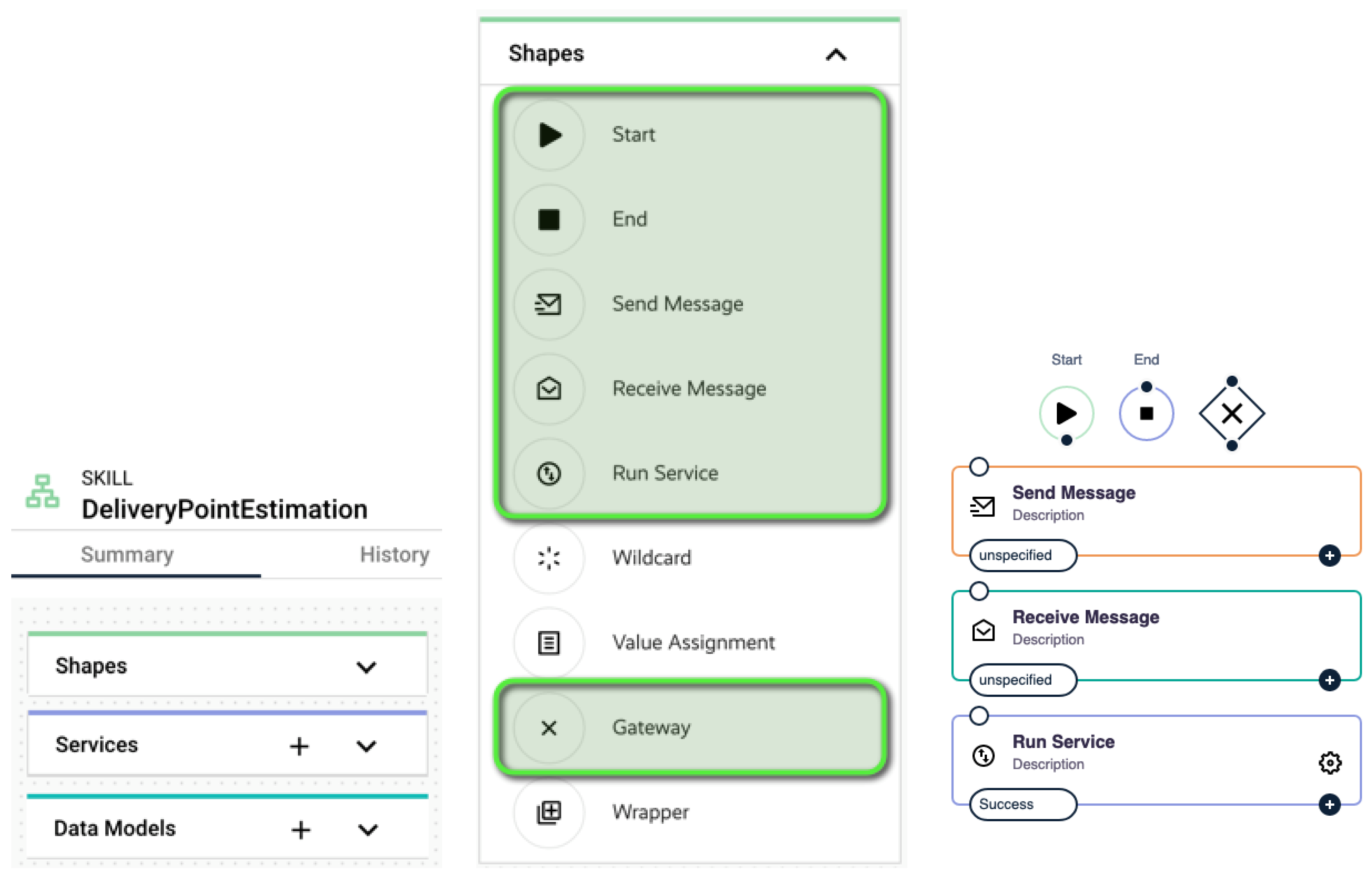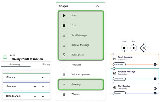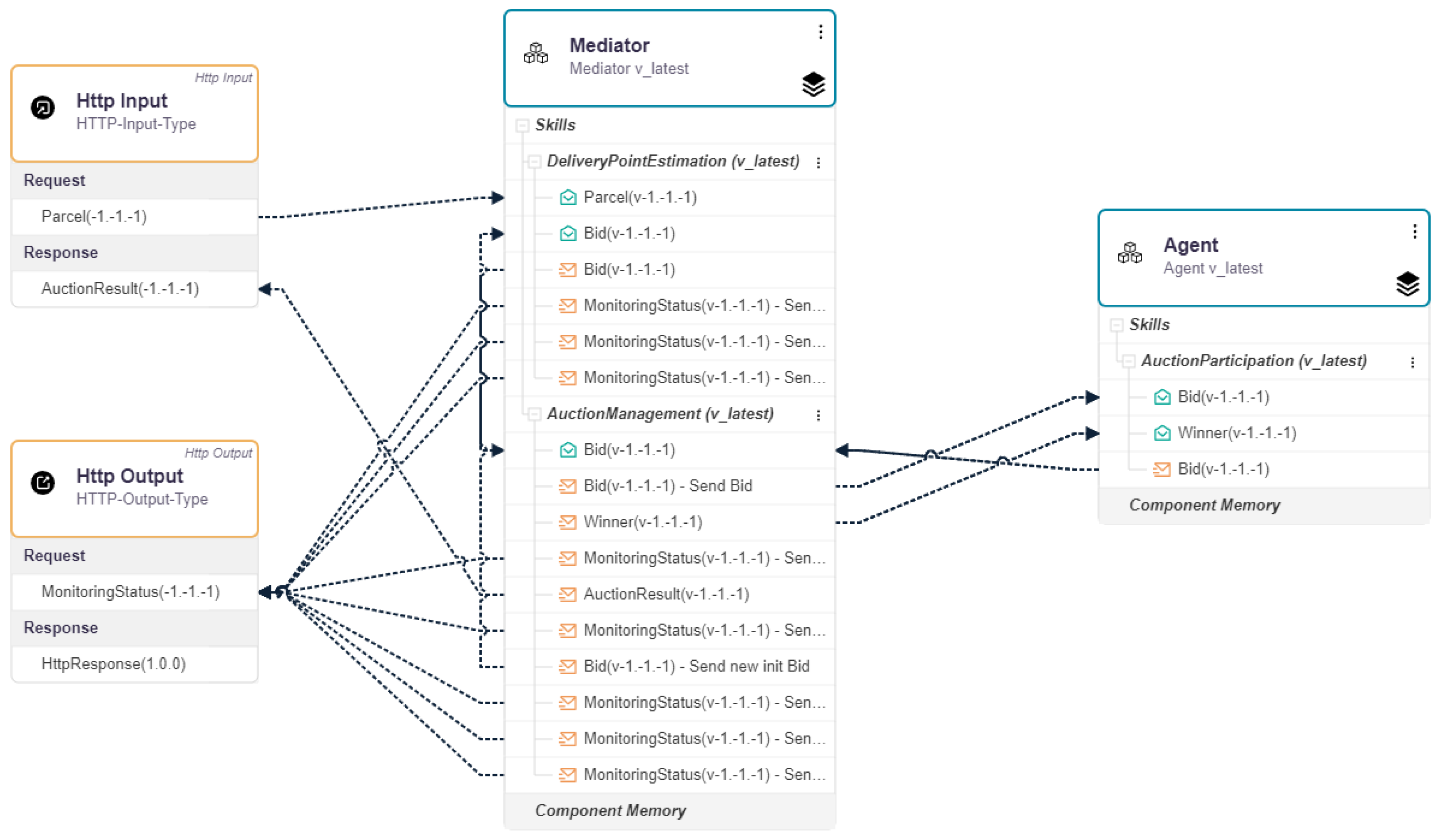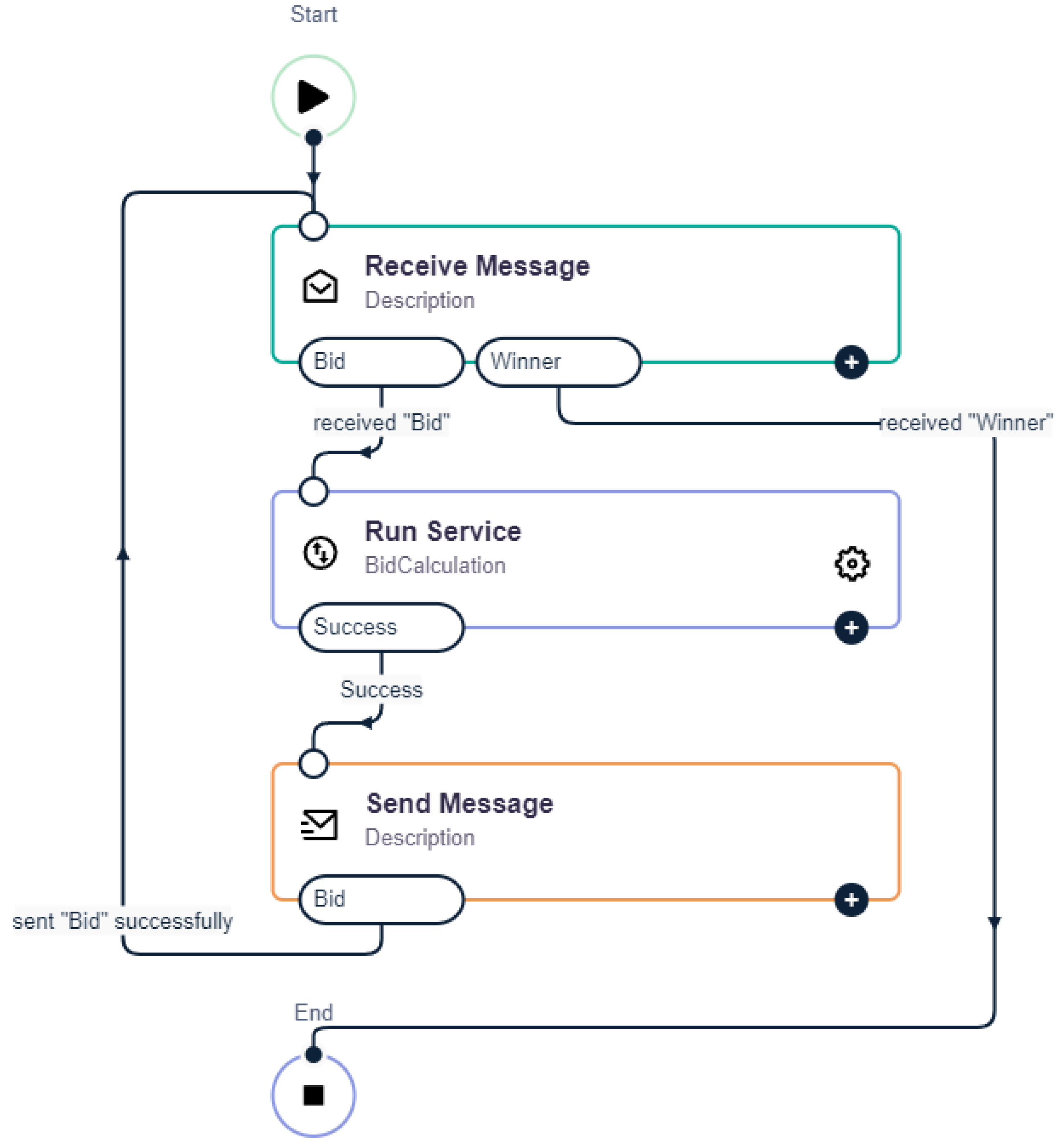 - Based on the message about the package to be delivered, a detailed analysis and evaluation are necessary. The logistics domain includes various metrics to this end; however, these are not part of this work. Instead, a value is calculated for the simulation based on a random number and the package properties to transform the delivery requirements into quantifiable delivery points. At the same time, this value represents the starting bid for the auction and is sent to the next skill. Two input points (the Receive steps) are necessary—one for package distribution and one in case an auction needs to be restarted.