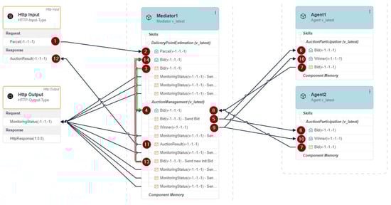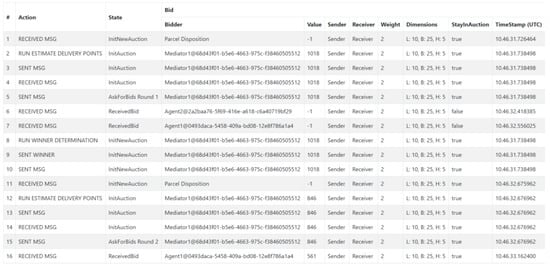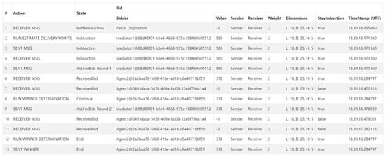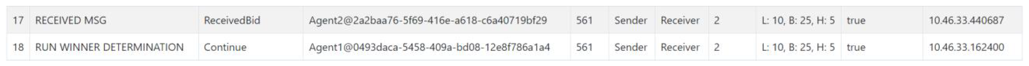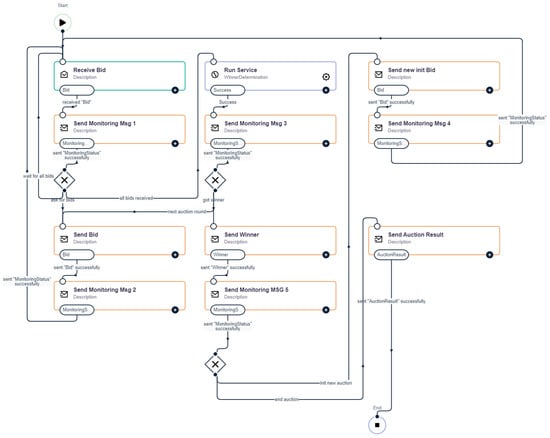 - If two or more agents submit the same bid, the first in the list is the best. During the winner determination process, the provisional winner is identified, and a decision is made regarding the possibility of a lower bid. This decision is recorded in the form of an auction status. If yes, then this provisional best bid is sent out as the new starting bid (send bid). If not, it must be checked whether the auction needs to be restarted or whether there is a real winner. If a new auction has to be started, the original starting bid is sent back to effort estimation (Send new init Bid). In any case, a message is sent to all agents (Send Winner). If a real winner has been determined, the auction result is sent back (Send Auction Result), and the process ends. Furthermore, the monitoring messages (Send Monitoring MSG n) are also visible after each send, receive, and service step.