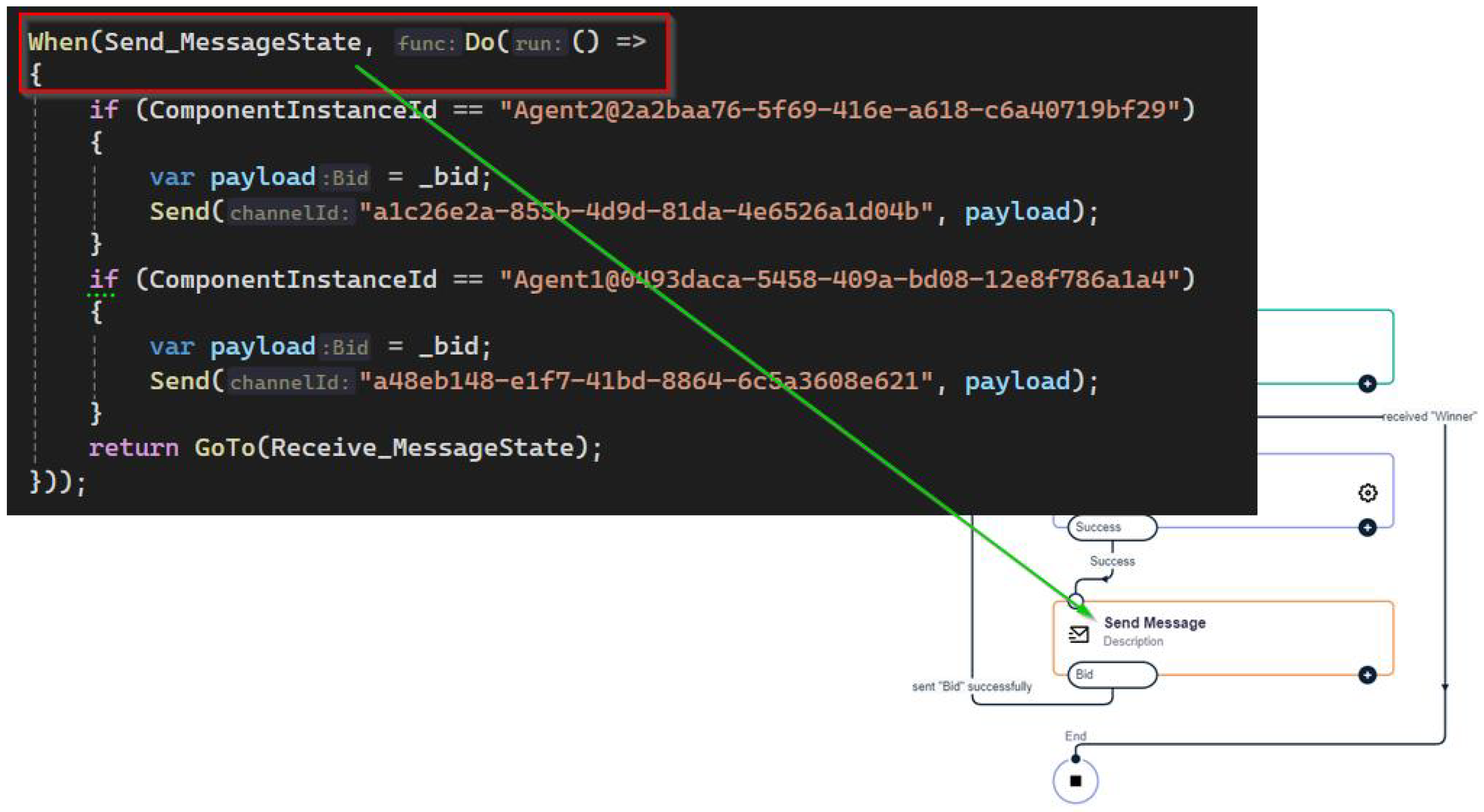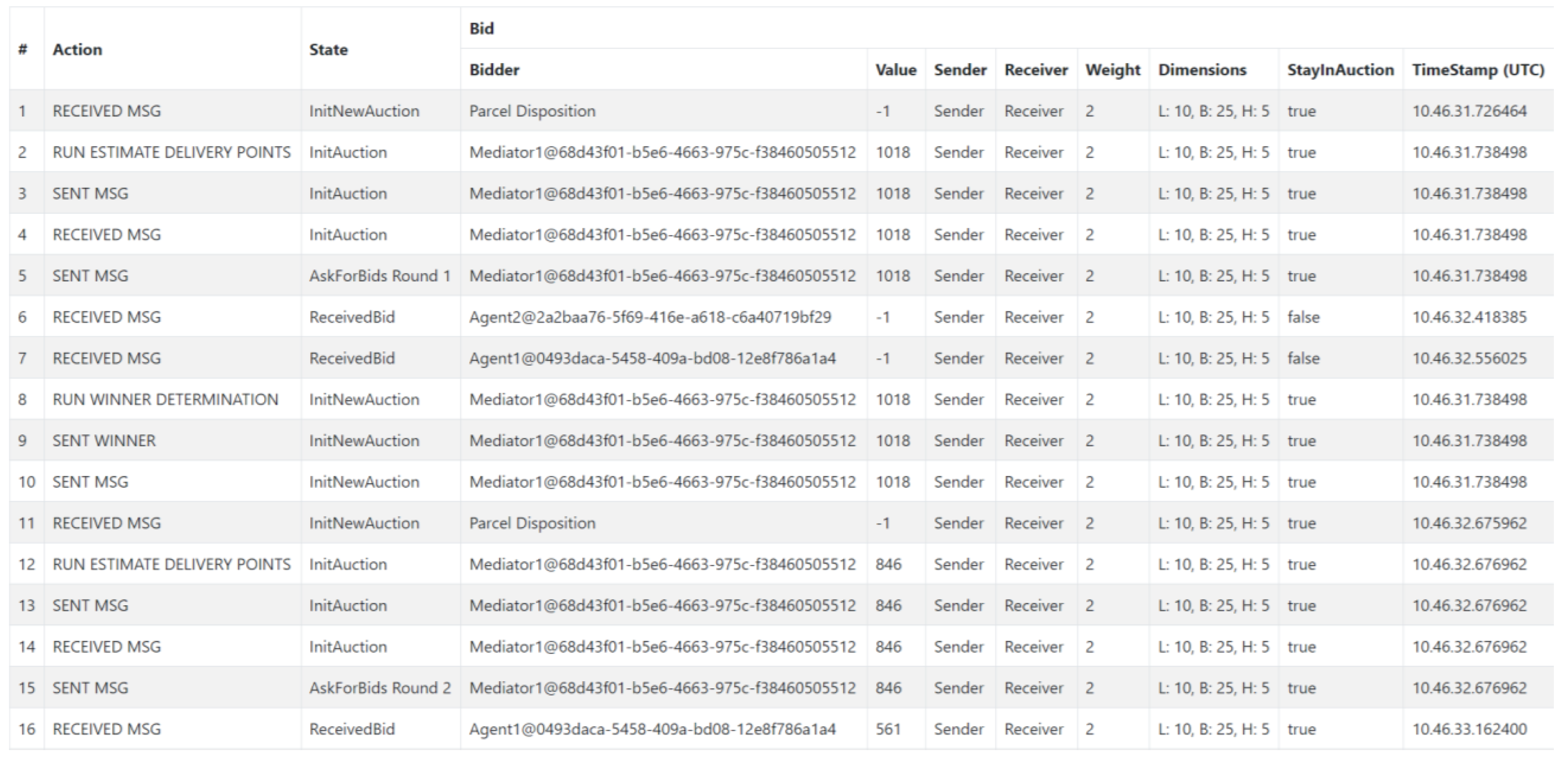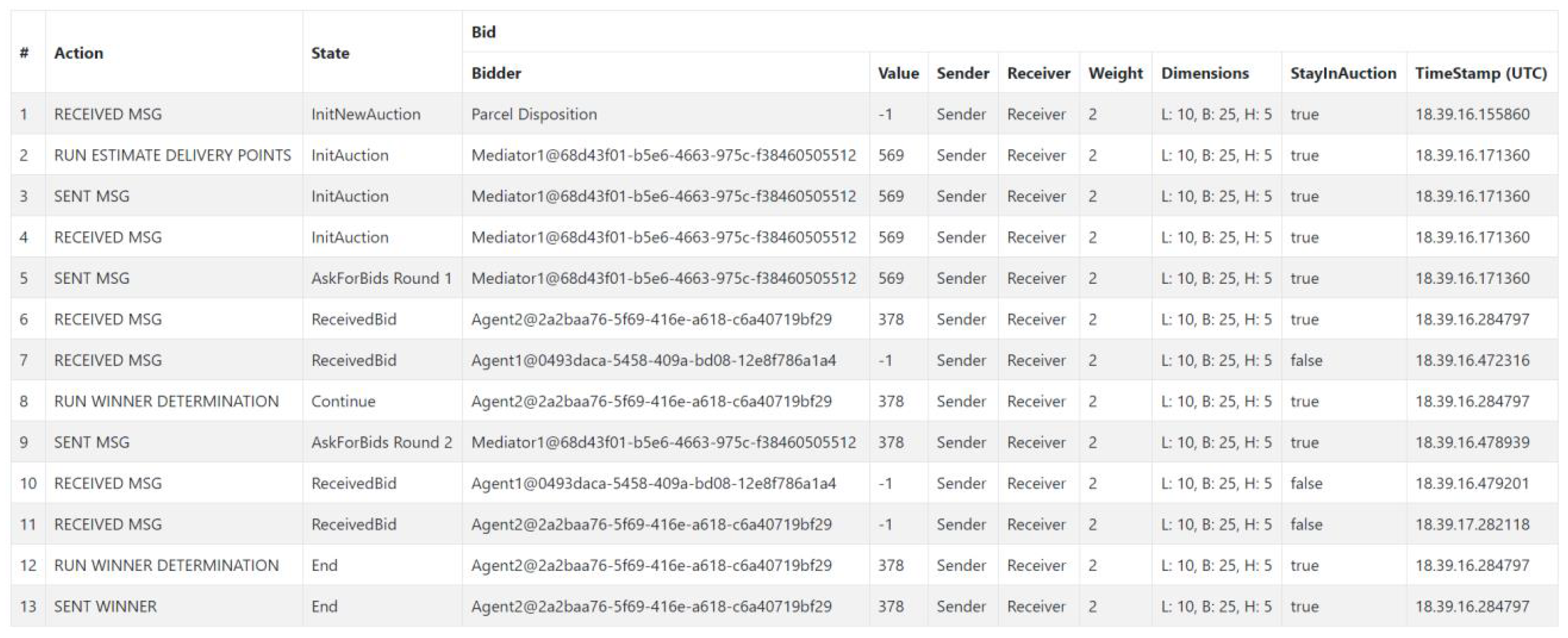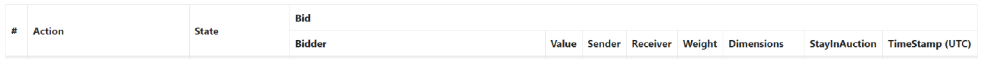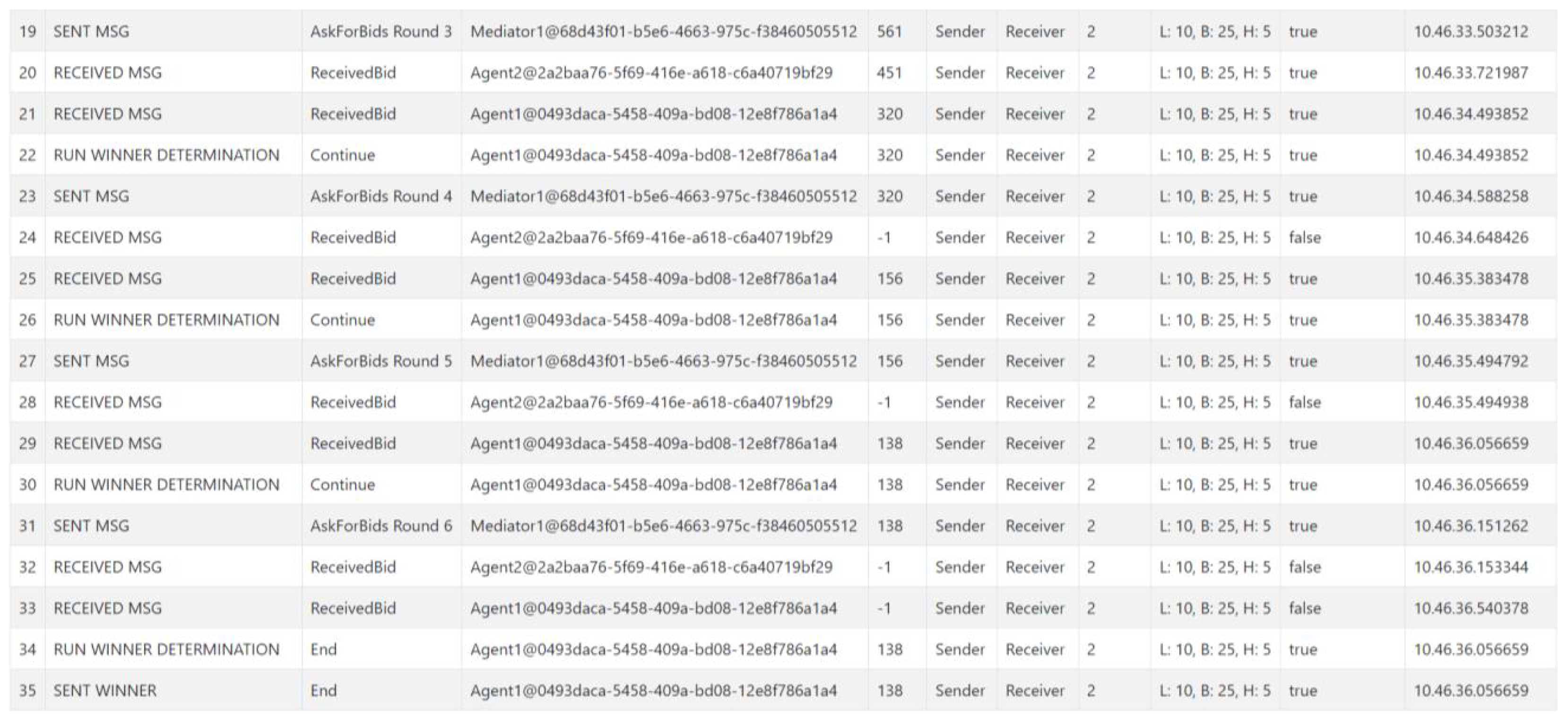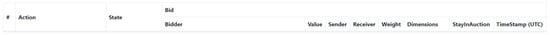 - Based on the received starting bid, either a lower bid or an exit is determined. Dropping out means that no lower bid can be submitted. If a bid has already been submitted and it was the best, the agent can still win the bid despite the withdrawal. In any case, the mediator is informed by a message. The exact calculation of the value is, again, the responsibility of the corresponding domain. For simulation purposes, a value is calculated using a random number and the packet properties. If an agent has already decided to exit in a previous round, it receives another bid request for the corresponding object. This is necessary due to the tool’s restrictions, which prevent messages from being sent or received dynamically and selectively. The process at the agent level is only terminated when a winner has been determined. This is necessary so that the bid instance remains active at the program level and any interim results can be accessed.