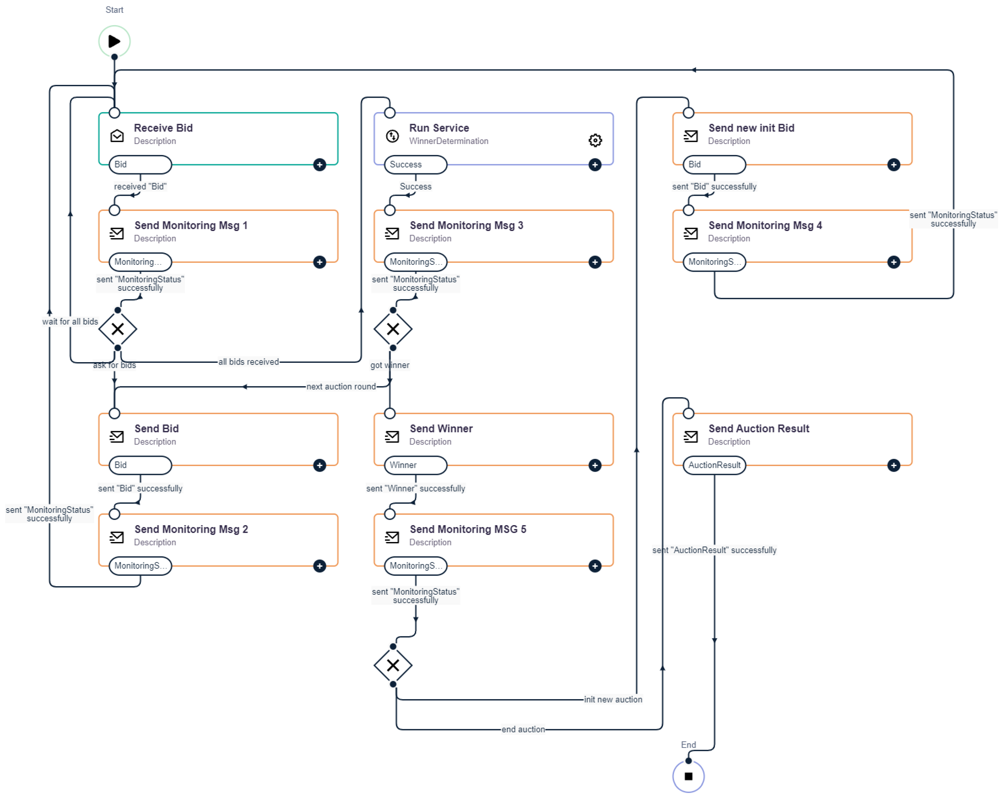 - After the starting bid has been determined, the auction must be managed. The auction object including the starting bid must be sent to all agents. There is also the task of receiving bids or exit information and processing them accordingly. Corresponding status states are necessary to track the auction. In the reverse auction, bids are evaluated to determine the lowest acceptable bid at the time. This bid also serves as the new starting point for the next round. As the Compunity ToolSuite [27] does not provide for the dynamic, selective sending of messages, the process must be adapted so that all agents are always notified, even if they have already dropped out. The auction only ends when no lower bid is received. The winning agent must then be informed of the winning bid. Again, all agents are notified. If all agents drop out immediately in the first round, effort estimation is immediately carried out again. This step is necessary due to the process assumption that no alternative is available.