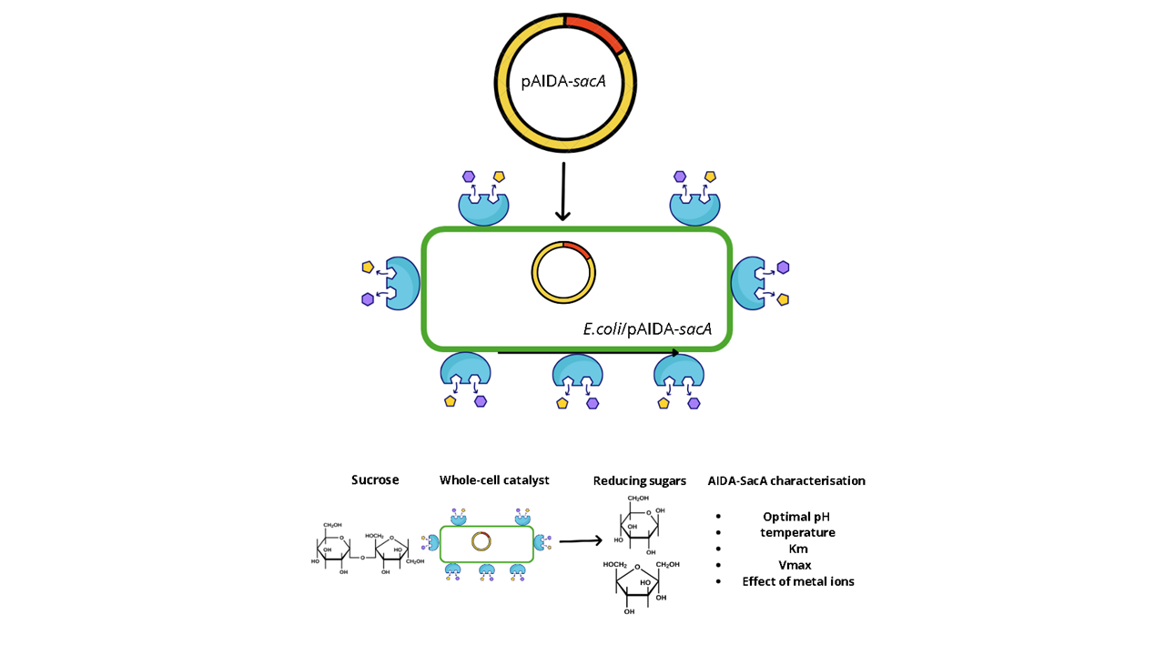 The Escherichia coli strain transformed with the pAIDA–sacA plasmid, which expresses the AIDA–SacA fusion protein, exhibits functional activity as indicated by saccharolytic assays, structural modelling, and enzymatic characterisation. The enzyme shows a Km of 1.18 mM, optimal activity at 40 °C and pH 7.0, and retains over 80% of its activity after 60 min at 45 °C, reflecting good thermal stability under mesophilic conditions. Potassium ions enhance enzymatic activity, whereas zinc, copper, and magnesium act as inhibitors. Protein expression is further confirmed by SDS–PAGE, which reveals a distinct band at approximately 114 kDa, consistent with the predicted molecular mass of the AIDA–SacA fusion. Collectively, these findings support the notion that SacA is surface-associated through the AIDA-I system and demonstrate the functional expression of a sucrase on E. coli cells. Further studies incorporating biochemical assays such as protease accessibility, immunofluorescence, or cell fractionation are required to provide direct evidence of surface display and to confirm the robustness of this platform.