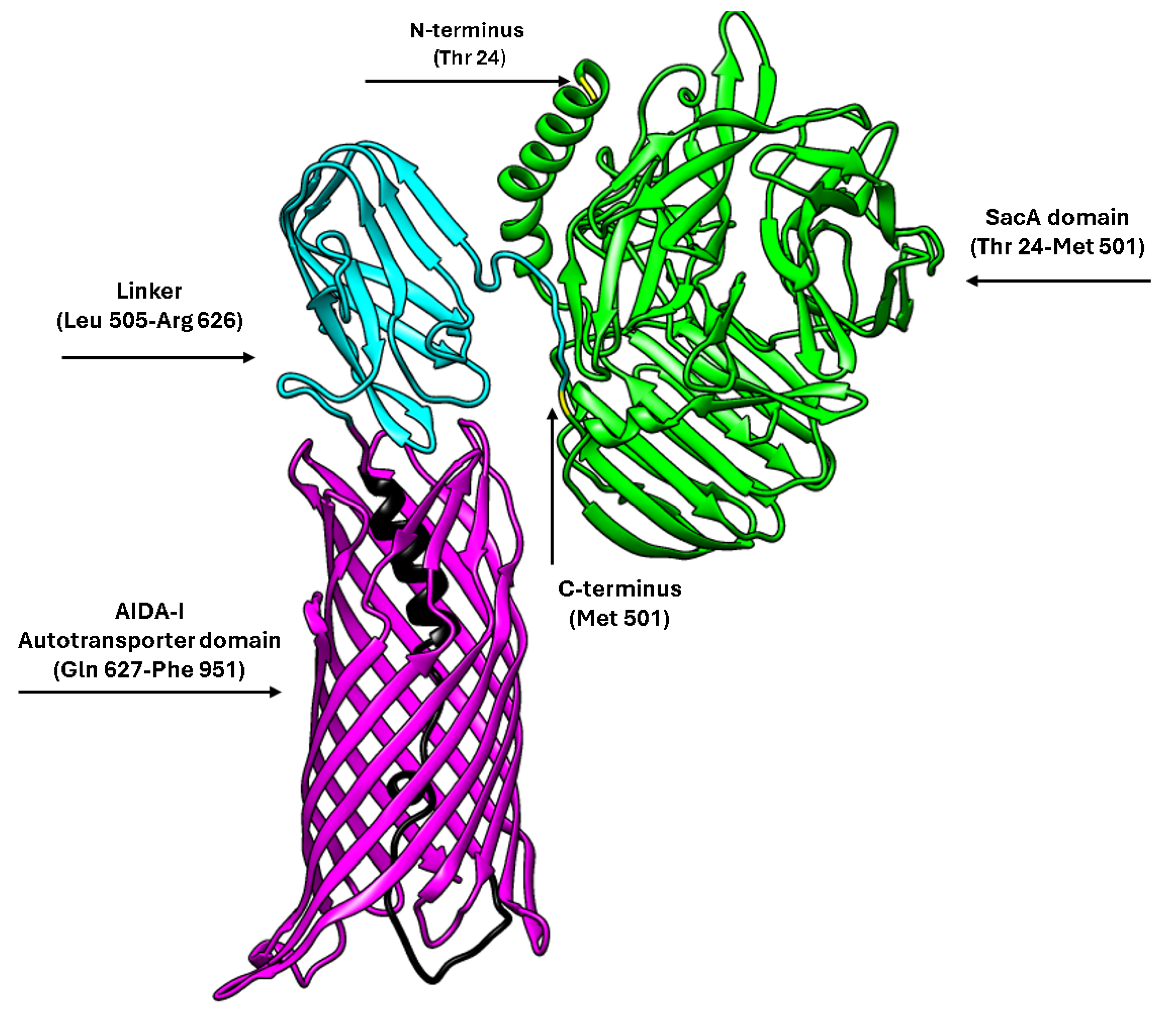 The structure of the AIDA-SacA fusion protein was predicted using the ColabFold v1.5.5 implementation of AlphaFold 2 (