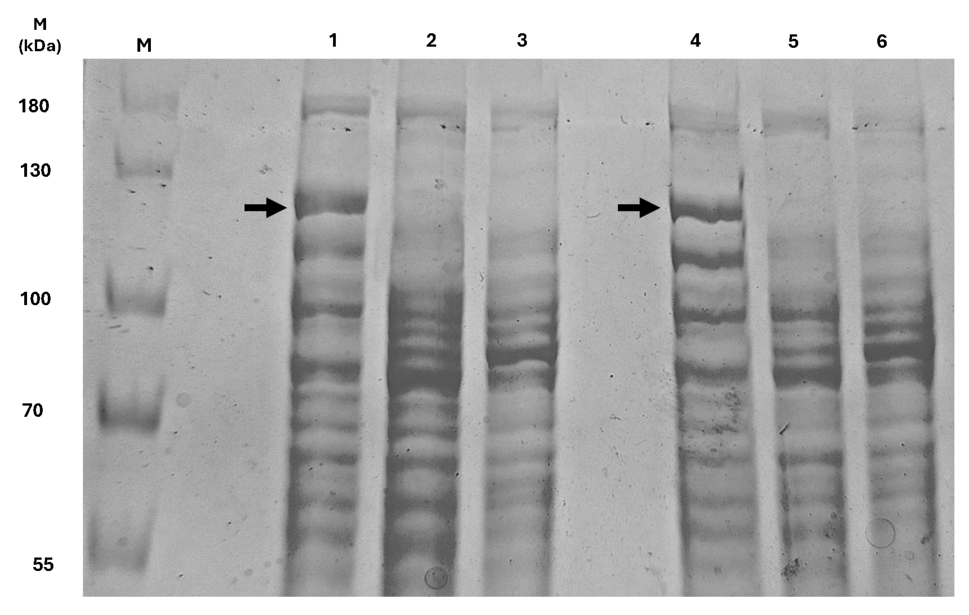 The presence of the AIDA-SacA fusion protein was confirmed by sodium dodecyl sulphate–polyacrylamide gel electrophoresis (SDS-PAGE) under denaturing conditions. Cell pellets were resuspended in phosphate buffer and subjected to sonication using short pulses while kept on ice to minimise thermal denaturation. The resulting lysates were mixed with Laemmli buffer (5×) (Bio-Rad Laboratories, Hercules, CA, USA) containing 10% SDS (Sigma-Aldrich, Burlington, MA, USA) and 5% β-mercaptoethanol (Bio-Rad Laboratories, Hercules, CA, USA) in a 4:1 (v/v) ratio, and the samples were then boiled at 95 °C for five min. Protein separation was carried out using a 12% polyacrylamide resolving gel with a 5% stacking gel (Bio-Rad Laboratories, Hercules, CA, USA), operated at a constant voltage of 120 V until the tracking dye reached the base of the gel. After electrophoresis, gels were stained with Coomassie Brilliant Blue R-250 (Bio-Rad Laboratories, Hercules, CA, USA) and subsequently destained overnight using a 40% (v/v) methanol–10% (v/v) acetic acid solution (CTR Scientific, Guadalajara, Mexico; reagent grade) until a clear background and well-resolved bands were obtained. Protein molecular weights were estimated using the Prestained PageRuler™ Protein Ladder (Thermo Fisher Scientific, Waltham, MA, USA; catalogue no. 266164) as a reference, which was run in parallel to determine the apparent sizes of the expressed proteins.