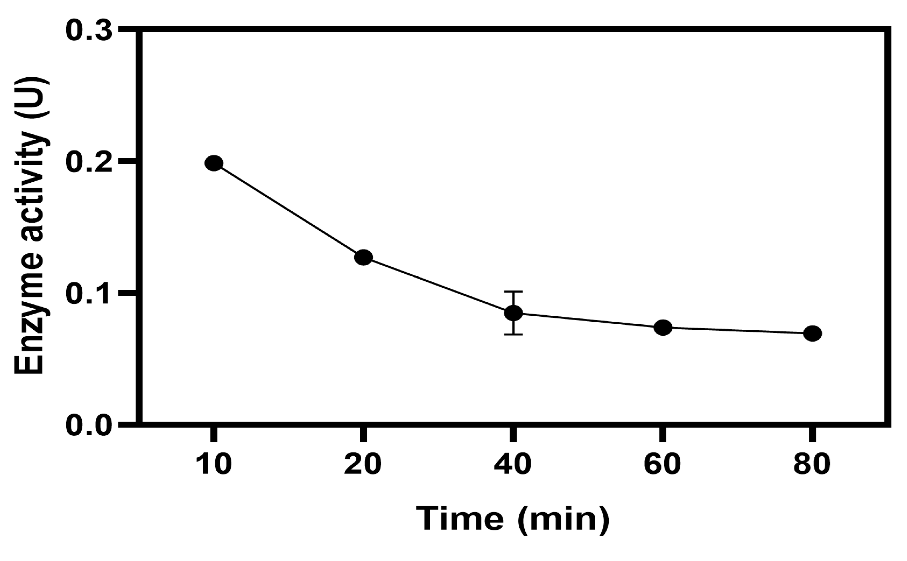The thermal stability of AIDA-SacA was evaluated by incubating the enzyme at 45, 55, and 65 °C for 15, 30, 45, and 60 min. After each incubation period, aliquots were withdrawn and immediately cooled on ice to halt enzymatic activity. Residual activity was assessed under standard assay conditions using 5 mM sucrose in potassium phosphate buffer (pH 6.5). The amount of reducing sugars released was quantified using the DNS method. Enzymatic activity was expressed as a percentage relative to the initial (non-incubated) enzyme activity. All experiments were performed in triplicate, and results were reported as the mean ± standard deviation.