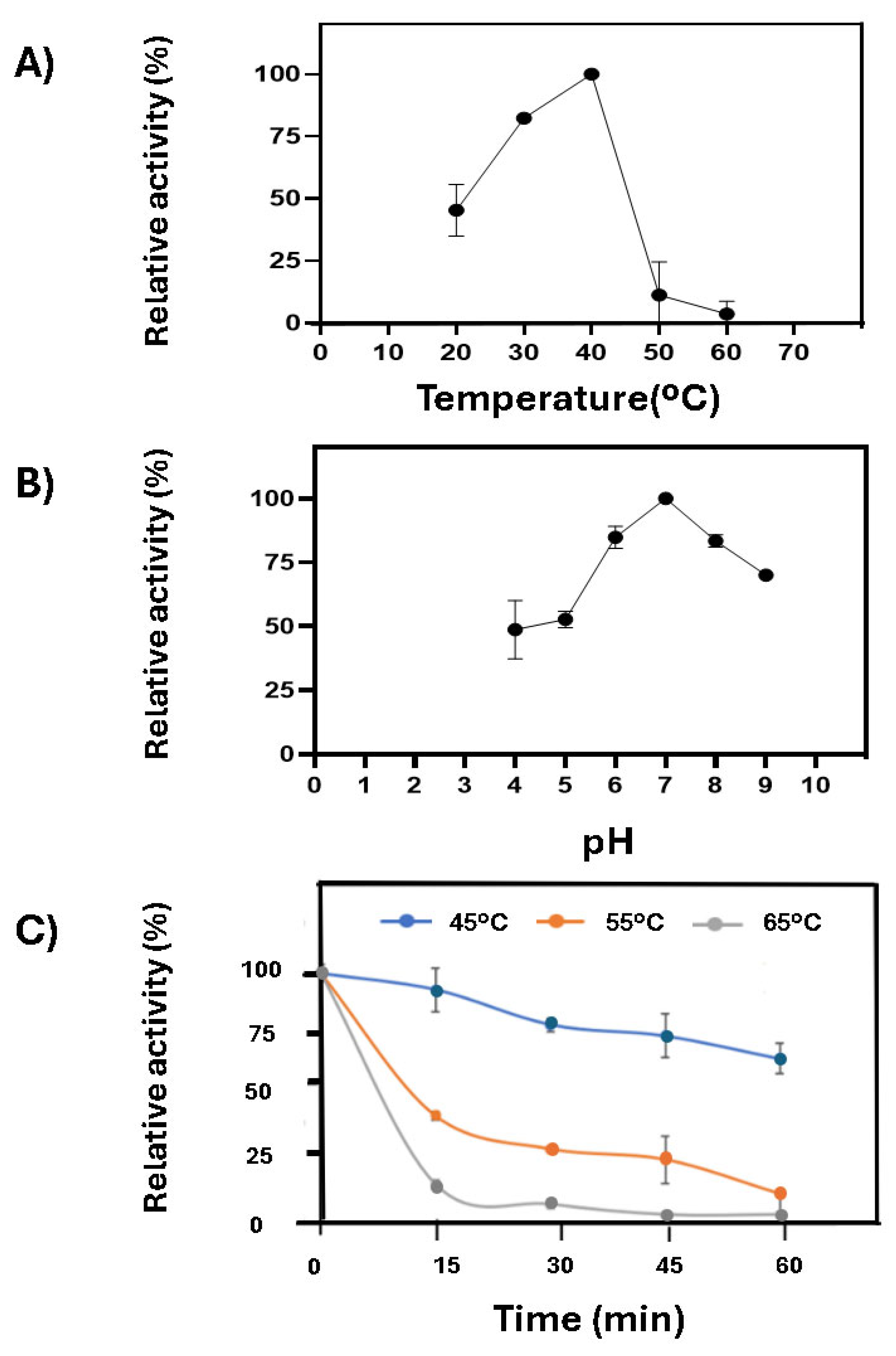 The optimum pH for AIDA-SacA activity was determined by performing enzymatic assays at pH 3, 4, 5, 6, 7, 8, and 9. Reactions were carried out in 50 mM Robinson’s buffer, which consists of 50 mM phosphoric acid (Karal, Guanajuato, Mexico; reagent grade), 50 mM boric acid (CTR Scientific, Guadalajara, Mexico; reagent grade), and 50 mM acetic acid (Karal, Guanajuato, Mexico; reagent grade). The assays were performed at the optimum temperature determined from the temperature experiments, using 5 mM sucrose as the substrate. Enzymatic activity was measured by quantifying the reducing sugars released using the DNS method. The enzyme preparation was incubated at each pH for 60 min, and reactions were stopped by heating at 95 °C for 5 min. Activity at each pH was expressed as a percentage relative to the maximum observed activity. All experiments were performed in triplicate, and results were reported as the mean ± standard deviation.
