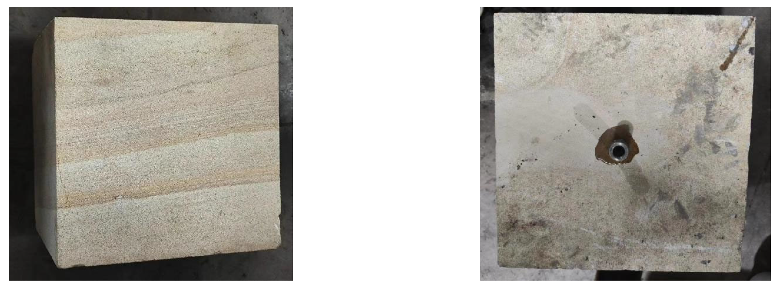 This sample was taken from the field outcrop of the target layer. Using a rock cutter, the sample was cut into cubic rock blocks with a size of 300 mm × 300 mm × 300 mm, and a φ 6 mm × 120 mm fracturing pipe was pre-embedded on one side (