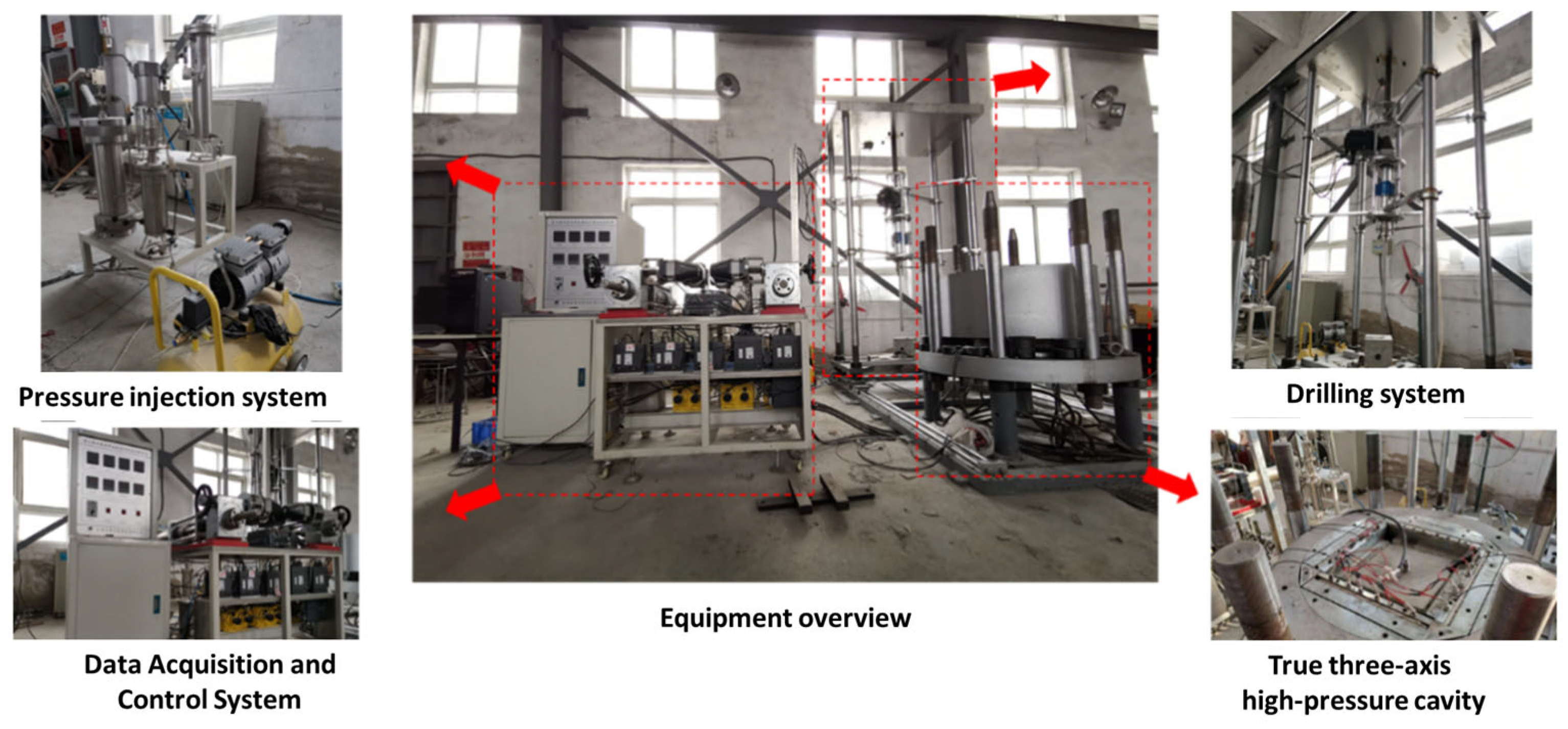 The true triaxial hydraulic fracturing experiment carried out in this research adopted the pressure drive physical simulation experimental device and the triaxial stress–fluid–structure coupling experimental system independently developed by Xi’an University of Science and Technology. The experimental system consists of a high-pressure chamber, a stress loading and control system, a fracturing system, a testing system, and a data acquisition and control system, etc. Meanwhile, the influences of temperature field, seepage field, and stress field, etc. on the fracturing of rock samples were considered. During the simulation test, a high-precision strain acquisition device and a gas pressure and flow monitoring system were utilized to analyze the variation laws of pump pressure, flow rate, and time during the pressure drive process. Using the fracturing system, the hydraulic fracturing characteristics of rock samples under true triaxial stress were studied, and the variation laws of characteristic parameters such as the fracturing initiation pressure, fracturing frequency, fracturing direction, and permeability of rock samples were analyzed. The acoustic emission system is equipped to detect the crack initiation and spatial distribution characteristics. The application of true triaxial overpressure and tridirectional loading can achieve static and dynamic loads. The overpressure loading is 30 Mpa, which can simulate the seepage experiment under true triaxial conditions. It can help us detect the fracture initiation and propagation characteristics, as well as the acoustic emission characteristics during the fracturing process, so as to conduct flow detection, temperature detection, and stress–strain detection.