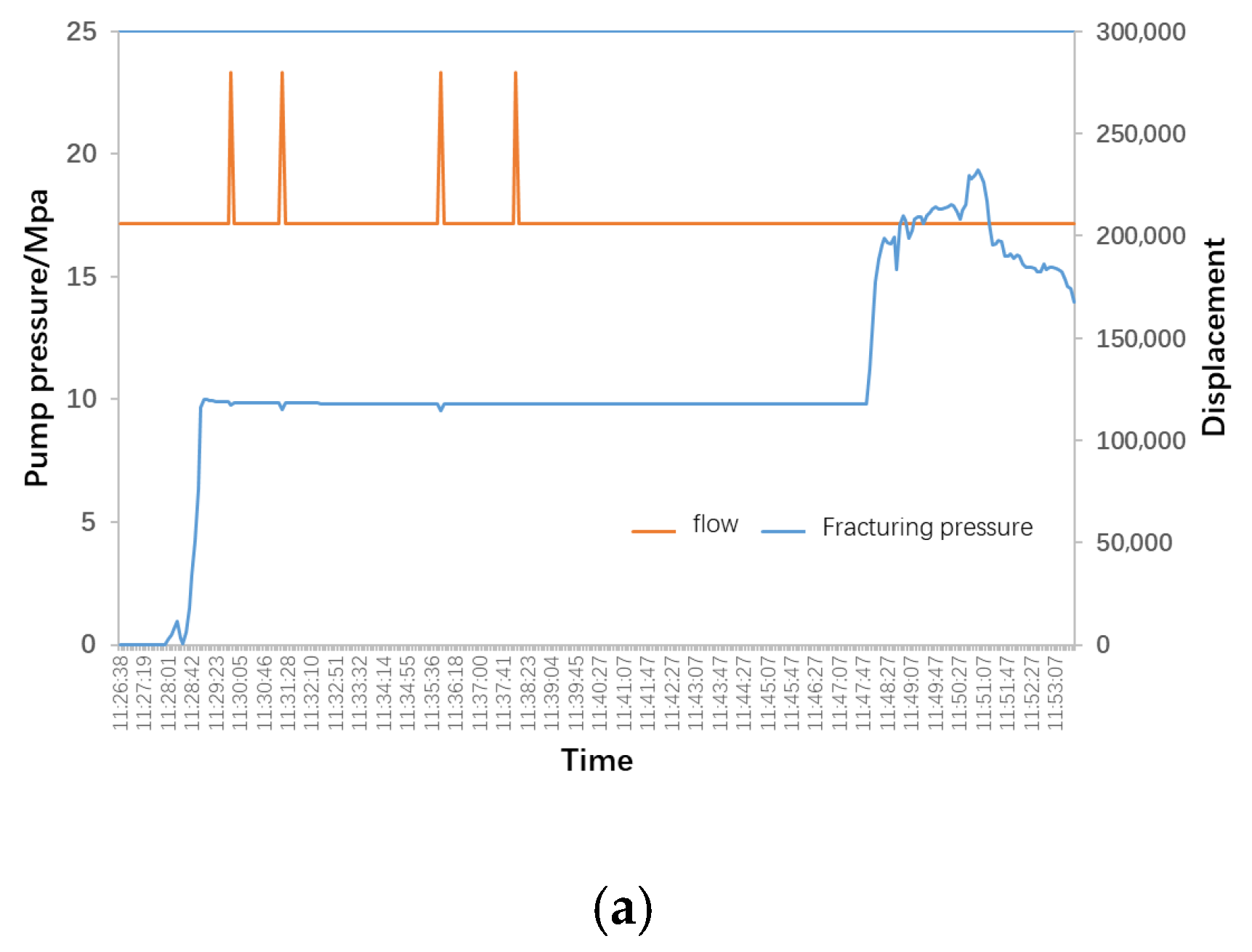Each time the displacement is increased, there will be a pulse of pressure that first rises and then falls. After that, the pressure remains stable and unchanged until the next change in displacement. Before approaching the rupture pressure (18.1 Mpa/25 Mpa), the crack penetration is achieved, during which micro-cracks are generated.